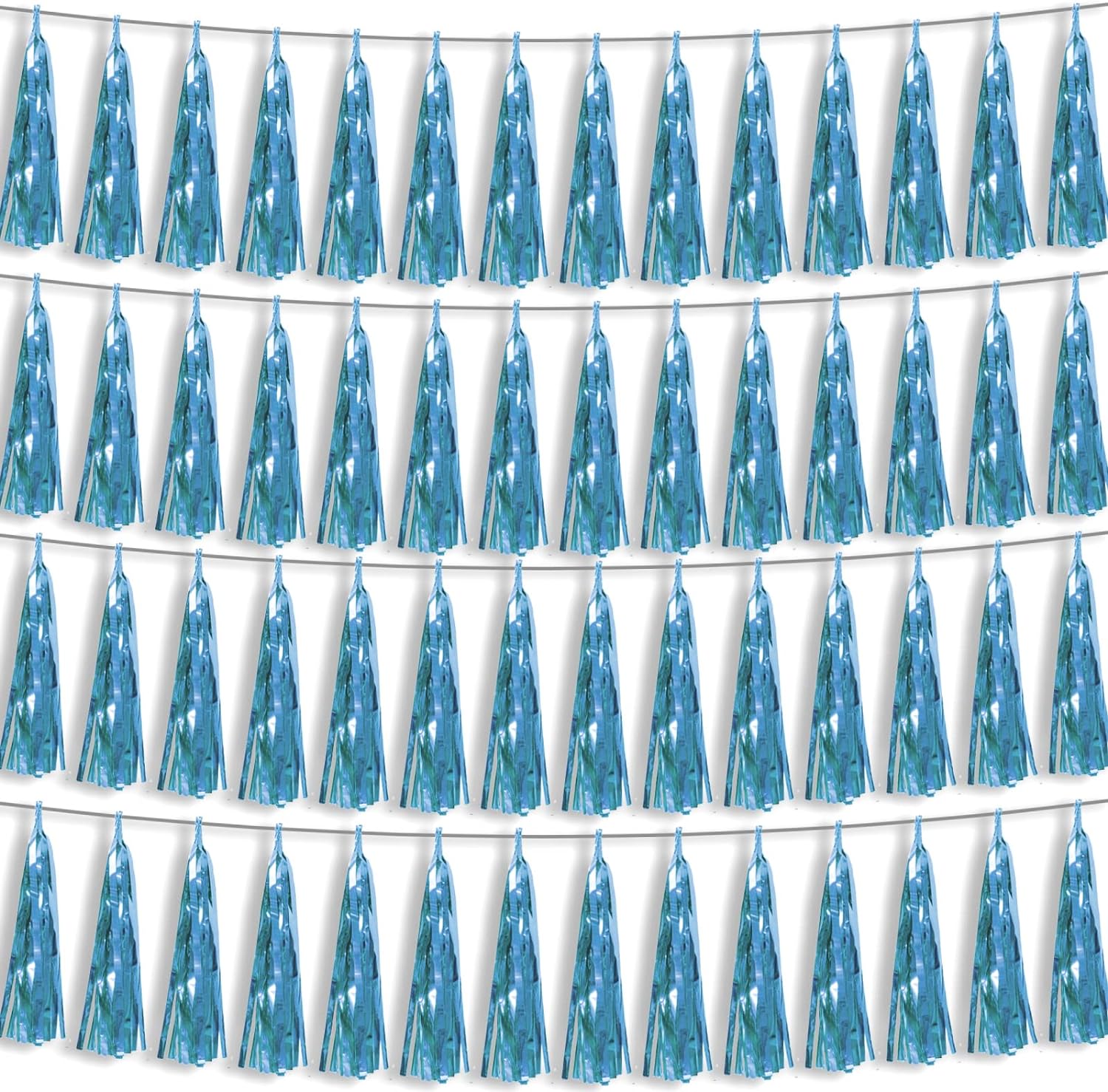 4P Light Blue Foil Fringe Metallic Streamers Banner Tassel Garland for Parade Floats, Bachelorette, Wedding, Birthday, Halloween, Christmas, Bridal/Baby Shower Party Decorations
