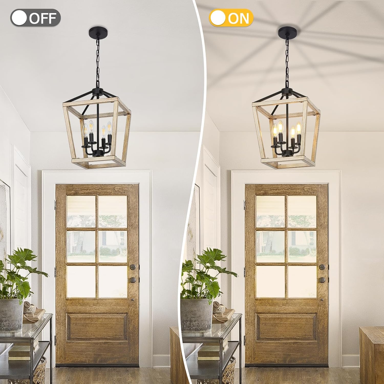- Light Fixture with Brushed Rustic Oak: Featured with black center candlestick and brushed rustic oak metal frame, the chandelier is a wonderful addition to add farmhouse style to your home dรฉcor. Artistic and eye-catching, it can perfectly blend in bedroom, living room, bathroom, dining room, hallway or kitchen island(indoor use only)