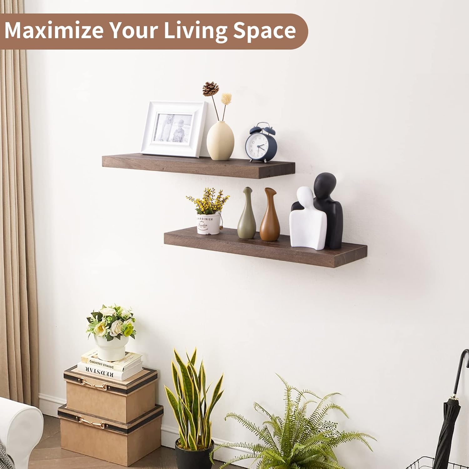 Axeman Floating Shelves for Wall, 24''W x 8'' D Rustic Solid Elm Wood Shelves for Storage, Wall Mounted Display Shelving with Invisible Heavy-Duty Metal Bracket (Walnut, 2PCs)