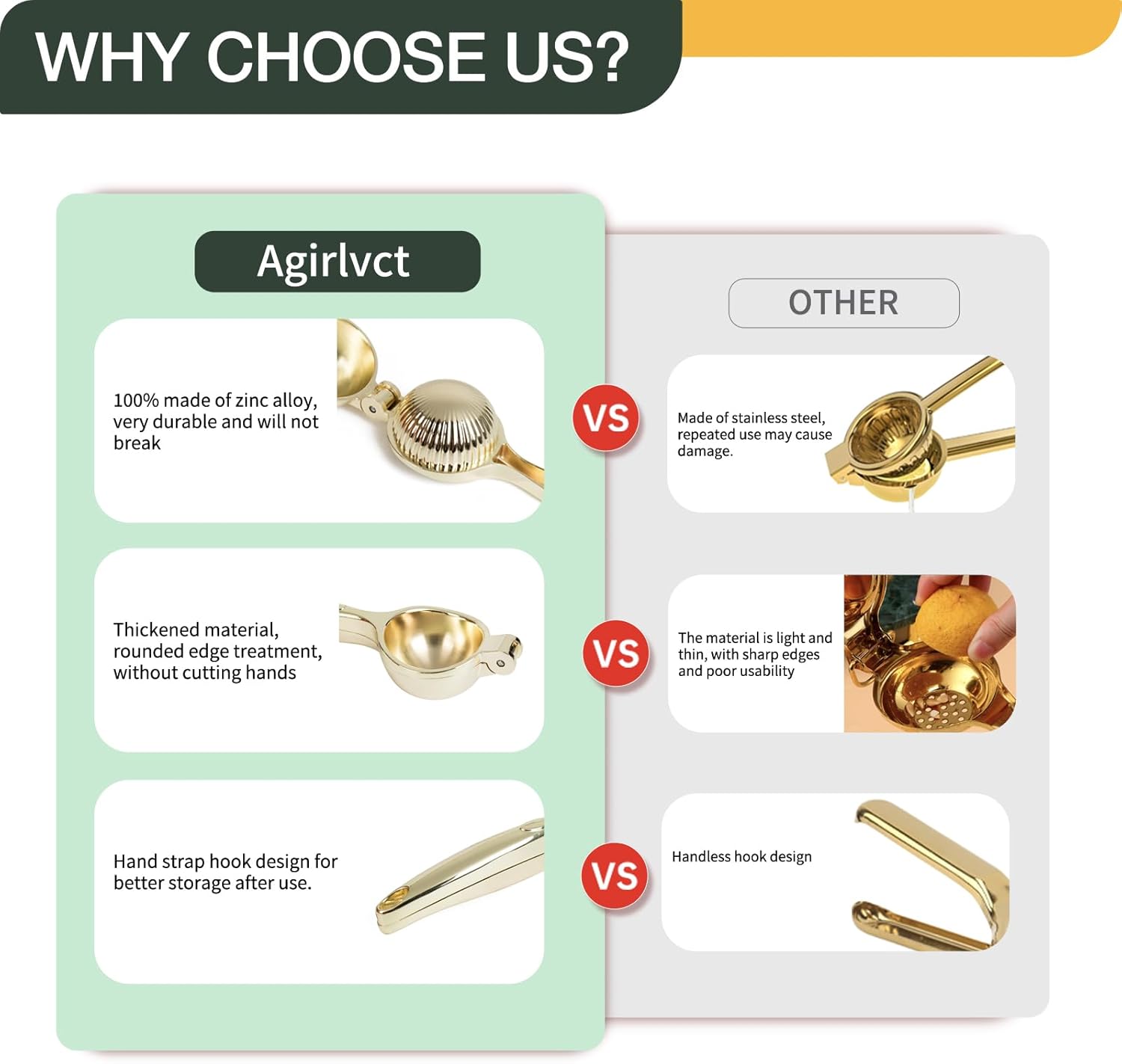 - High-Quality Materials : Lemon juicer squeezer is made of Zinc Alloy Most of the other squeezers are made of stainless steel. Compared to stainless steel, zinc alloy is thicker, more wear-resistant, and less prone to deformation and fracture.