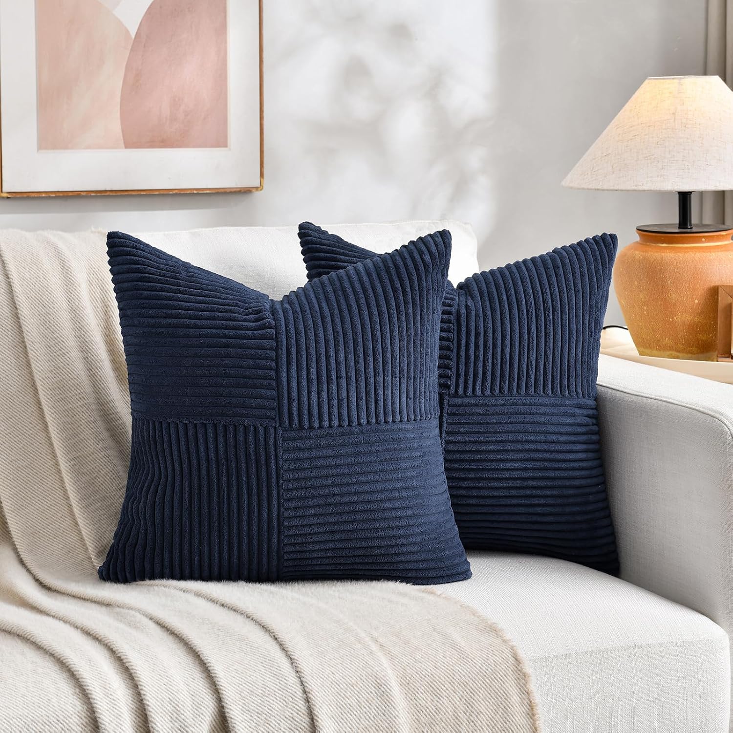 Fancy Homi 2 Packs Navy Blue Big Decorative Throw Pillow Covers 24x24 Inch for Living Room Couch Bed Sofa, Rustic Farmhouse Boho Home Decor, Soft Corss Corduroy Patchwork Accent Cushion Case 60x60 cm