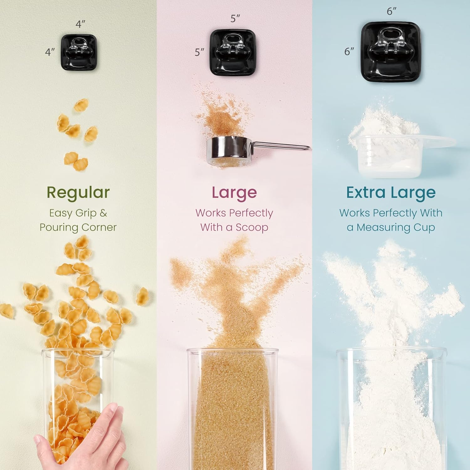 - 3 PIECES KITCHEN ORGANIZATION - BEGINNER SET (NEST-L): This beginner set comes with 3 different sizes of Flip-Tite container to help you find the best size to suit your kitchen pantry organization. 1 x 6" EXTRA LARGE-Tall(4.9qt), 1 x 5" LARGE-L(3.5qt), 1 x 4" REGULAR-M(0.8qt). Each size is perfectly calibrated to store common household staples including rice, cereal, pasta, spaghetti, baking ingredients, protein, smoothie powder, sugar, flour, coffee, snack, makeup, laundry supplies, and crafted storage.