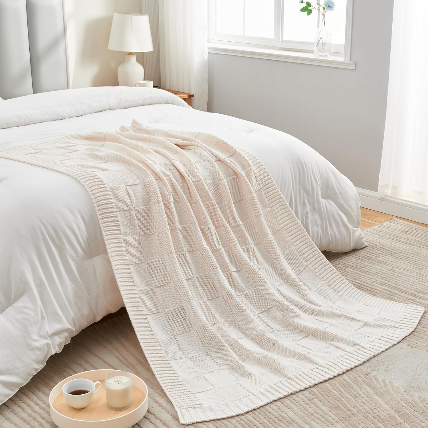 - DESIGN & STYLISH:The checks knitted pattern integrated with seed-stitch knit looks more classic and cute.This unique design gives the throw blanket a homespun look that's relaxed and inviting.This knit design is equally soft and chic, keeping you warm in style. This cream white throw blanket will look amazing draped over any couch or over the end of a bed to provide that sumptuous cozy look