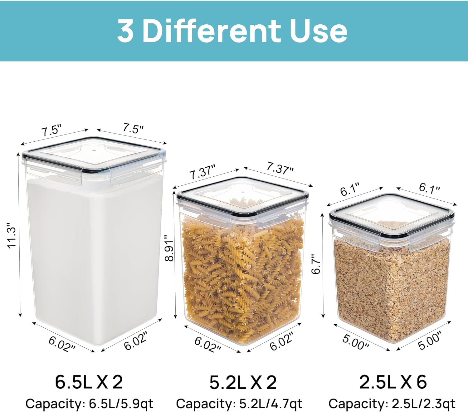 - 【3 Sizes for Different Purpose】--- Our 10 Pack flour and sugar containers comes with 3 different sizes, including 2 extra large containers (6.5L/5.9qt), 2 large containers (5.2L/4.7qt), 6 medium containers (2.5L/2.3qt) 4 measuring cups and 24 labels. Large capacity, perfect for storing your flour, sugar, or other bulk food.
