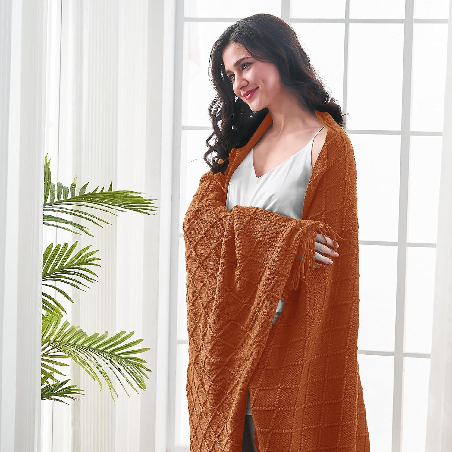 inhand Knitted Throw Blankets for Couch and Bed, Soft Cozy Knit Blanket with Tassel, Orange Rust Lightweight Decorative Blankets and Throws, Farmhouse Warm Woven Blanket for Men and Women, 60"x80"