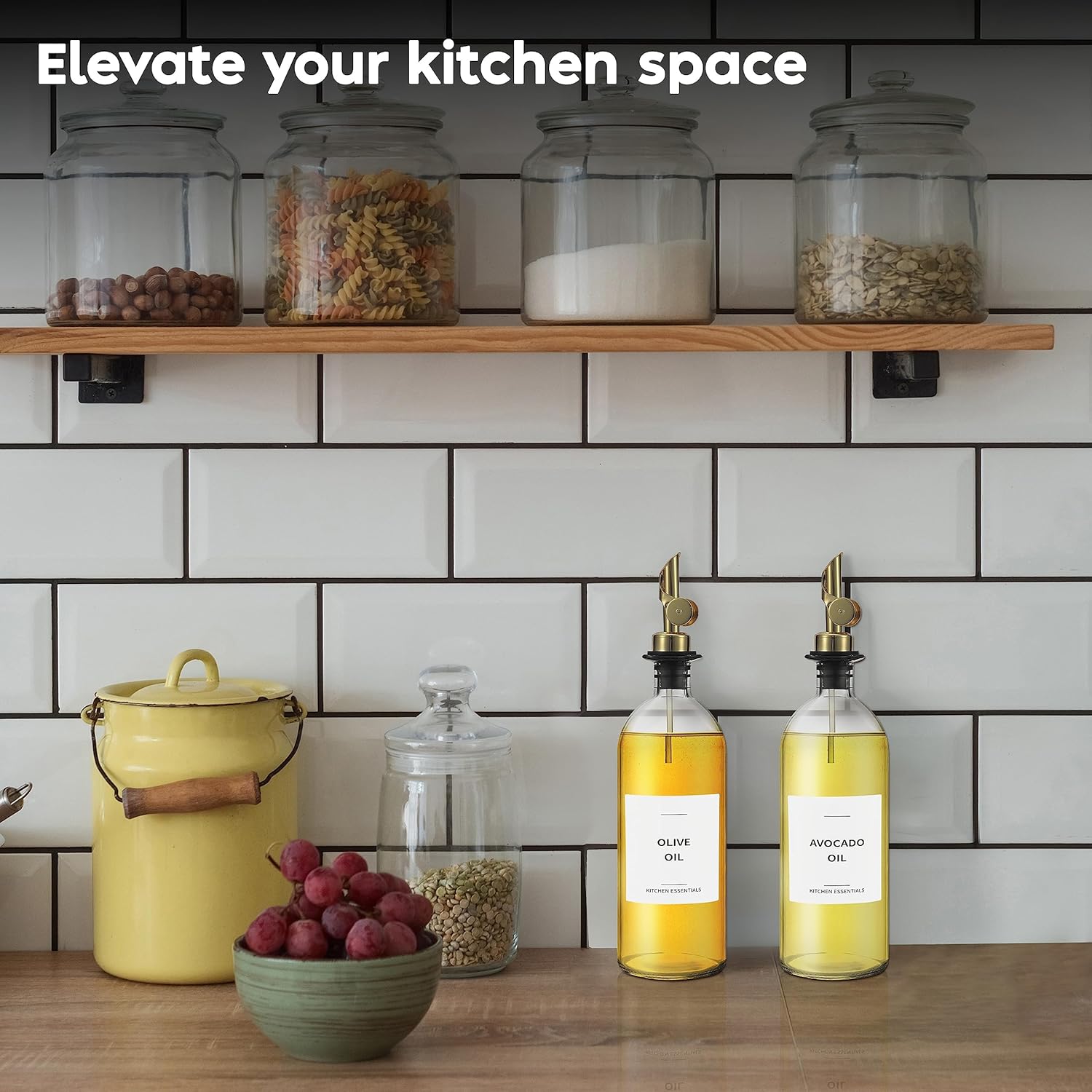 Olive Oil Dispenser Bottle - Includes 55 Kitchen Essential Labels - Cooking Oil Bottles for Kitchen, Coffee Syrup Dispenser - Pourer Spout with 16.9 fl oz Glass Container Cruet - 2pcs, Gold