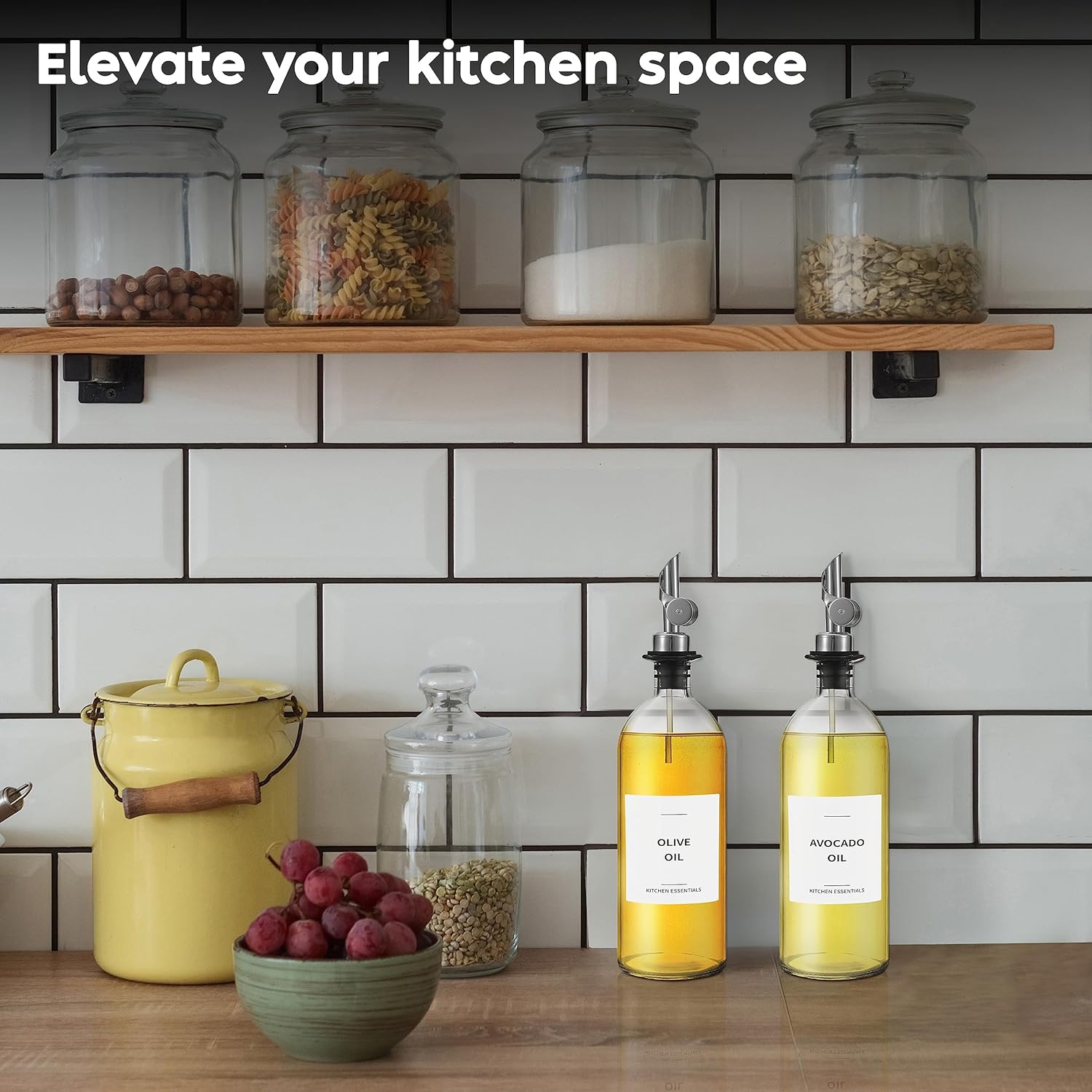 Olive Oil Dispenser Bottle - Includes 55 Kitchen Essential Labels - Cooking Oil Bottles for Kitchen, Coffee Syrup Dispenser - Pourer Spout with 16.9 fl oz Glass Container Cruet - 2pcs Silver
