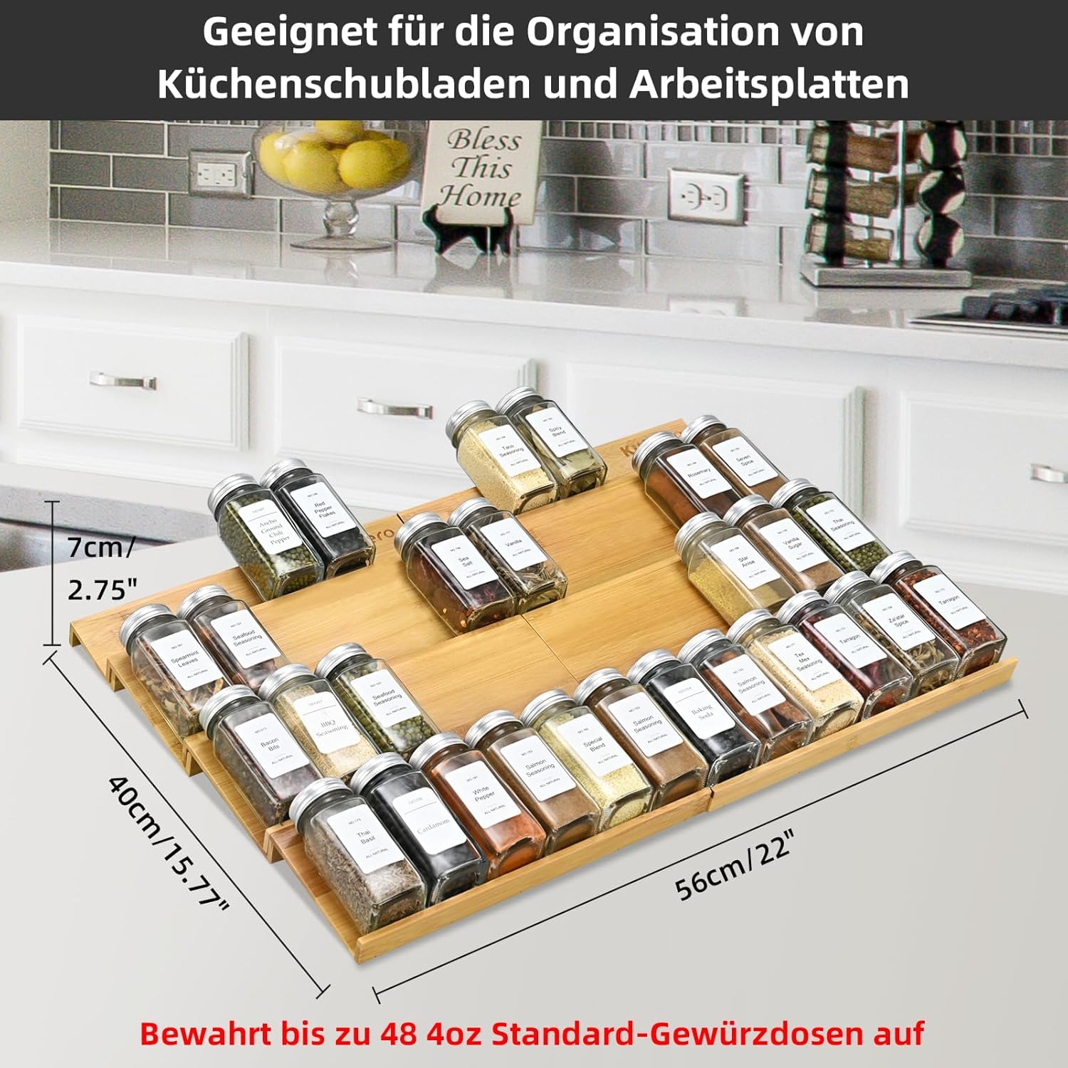- Perfect Size: Spice rack organizer for drawer MIN size: 22" wide x 15.8" deep x 2.75" high, standard 4 oz spice jars fit easily into the drawer sliding and closing completely.please measure your drawer before ordering!