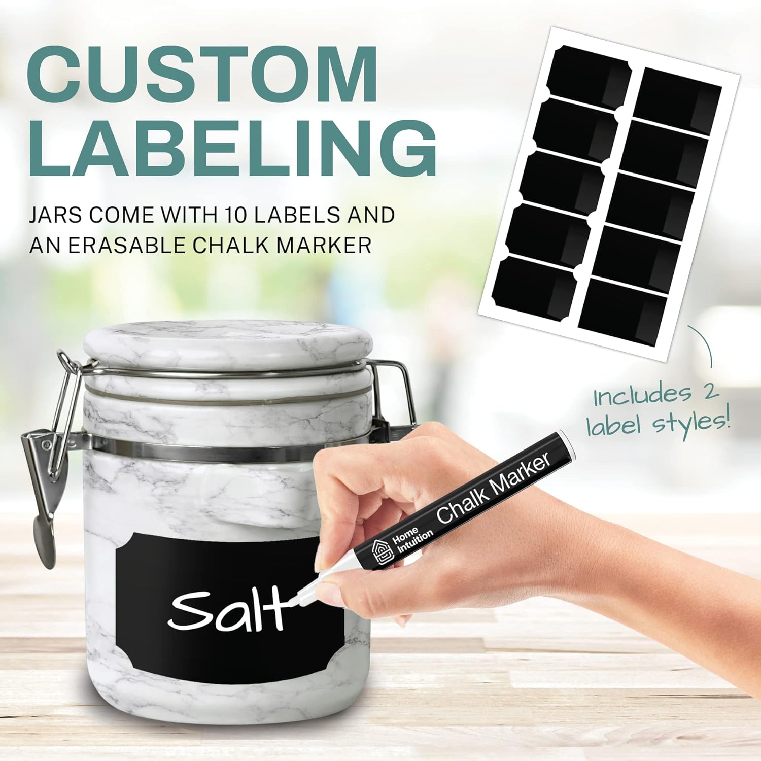 Home Intuition 4-Piece Ceramic Kitchen Canisters Set, Airtight Containers with Wooden Spoons Reusable Chalk Labels and Marker for Sugar, Coffee, Flour, Tea (White Marble)