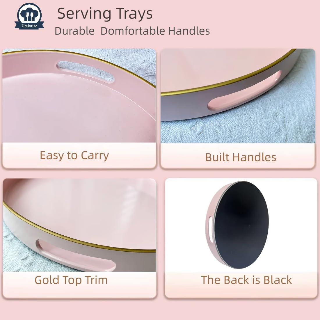- Design: The size of the pink tray is 13 inches, and it has two built-inhandles for easy carrying. lt has asimple, solid color finish with agolden top rim accent, and theedges are relatively smooth.
