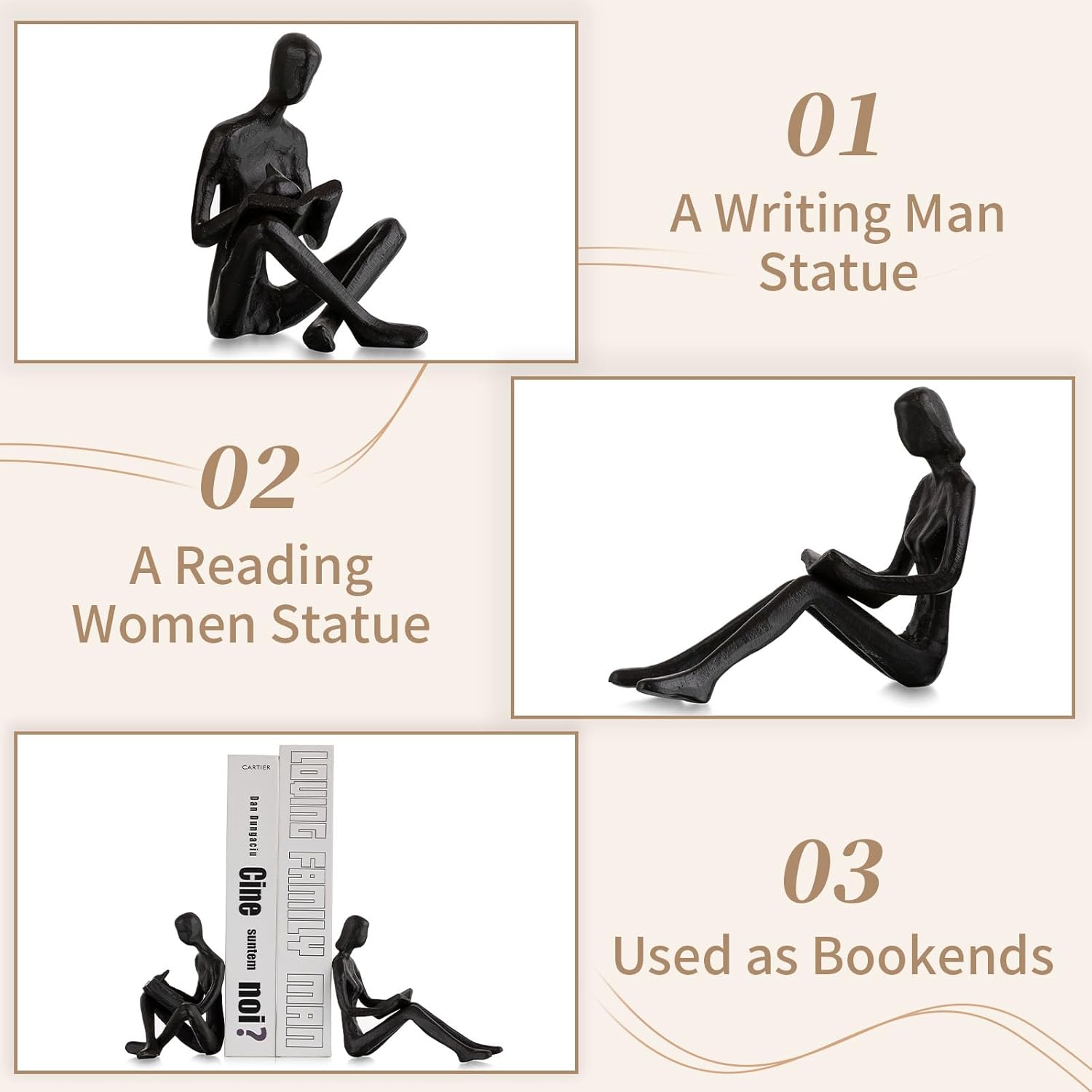 - ROMANTIC BOOKSHELF DECORATIVE OBJECTS- This 2 pcs cute figurine records a man and a woman read books, the black finish makes it like a silhouette look, adds a romantic flare for industrial and farmhouse style. This handcrafted statue adapts to any interior style with their black textured finish and organic quality.