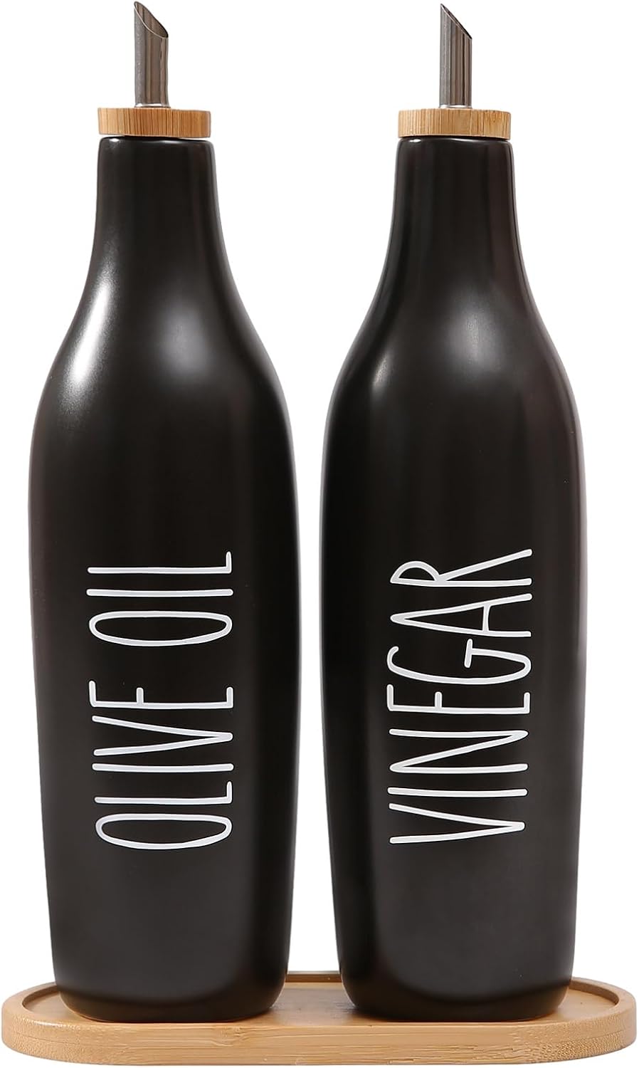 HOMCDALY Olive Oil and Vinegar Dispenser Set, Ceramic Oil and Vinegar Bottles with Bamboo Tray, 16.9oz Kitchen Cruet - Set of 2 - Black