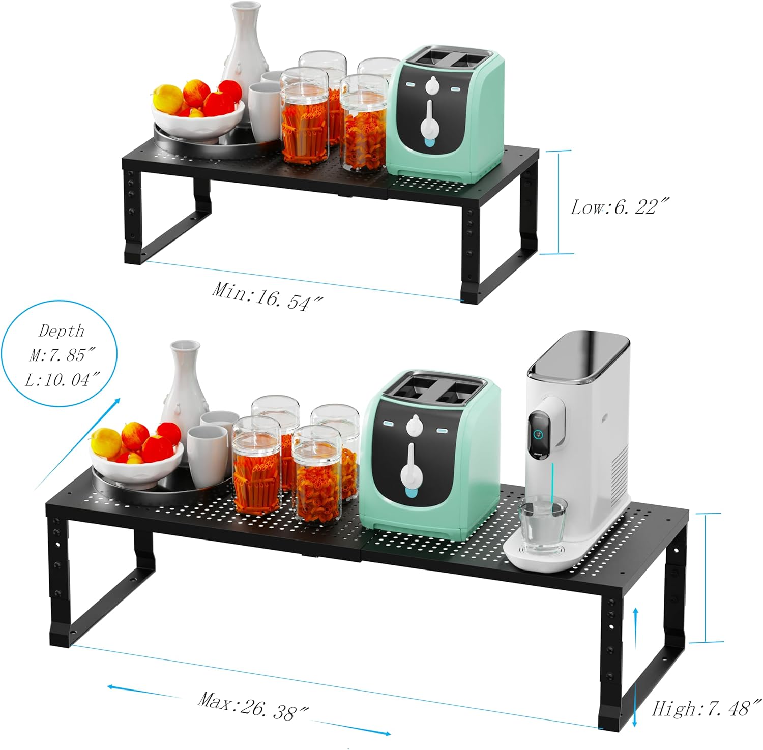 - β[Expandable & Stackable independent Cabinet Organizer]The Cabinet shelf length is flexible, it can be extended from 16.54~26.38" depending on how you want to organize your space (16.54"~26.38"L x 7.85/10.04"W x 6.22~7.48"H).You can use it alone, or multiple shelves stacked together to store your goods. To improve the storage space of the cabinet and max the storage efficiency.