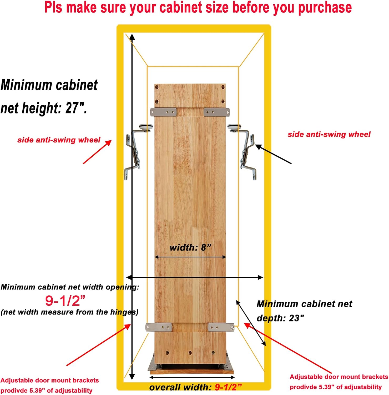 - ※ 【Large Storage Space】This spice rack organizer size is 8" W x 21.9" D x 25.2" H, the overall width included the sildes is 9-1/2" W, require at lest 9-1/2" W cabinet net width opening (net width measure from the hinge), Minimum cabinet net depth: 23"D This pull out spice rack each layer can hold at least 60 6oz spice jars / seasoning! Maximum save your space, keep your cabinets clean and tidy and stay away from clutter! The height of each tier is fixed.