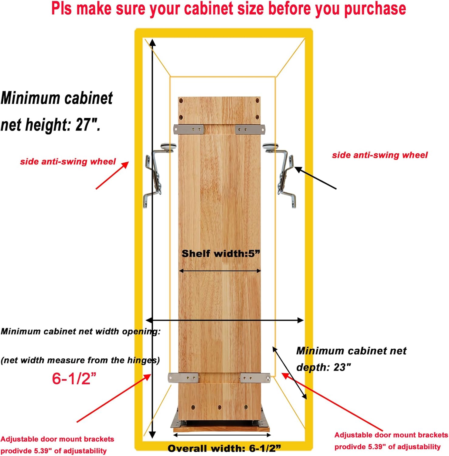 - ※ 【Large Storage Space】This spice rack organizer size is 5" W x 21.9" D x 25.2" H, the overall width included the sildes is 6-1/2" W , require at lest 6-1/2" W cabinet net width opening (net width measure from the hinge), Minimum cabinet net depth: 23"D. This pull out spice rack each layer can hold at least 14 jars spice / seasoning! Maximum save your space, keep your cabinets clean and tidy and stay away from clutter! The height of each tier is fixed.