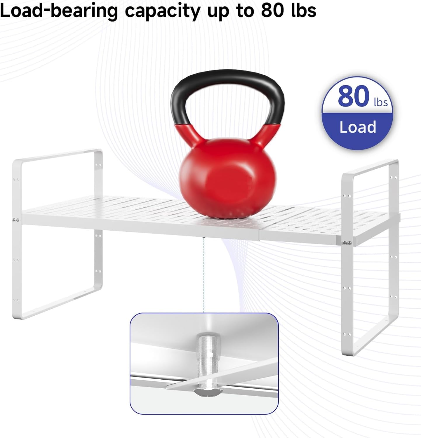 - ăHeavy-Duty Capacityă This cabinet shelf organizer is built to last, with a durable and sturdy construction that can support up to 80 lbs of weight, making it perfect for storing even your heaviest kitchen items.
