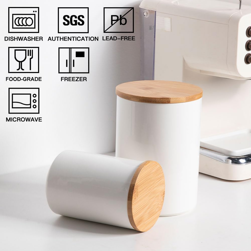 Sweejar Kitchen Ceramic Food Storage Containers Set, Stackable Canisters for Countertop with Airtight Boomboo Lids for Serving Ground Coffee, Tea, Sugar, Salt and More- Set of 2 (White)