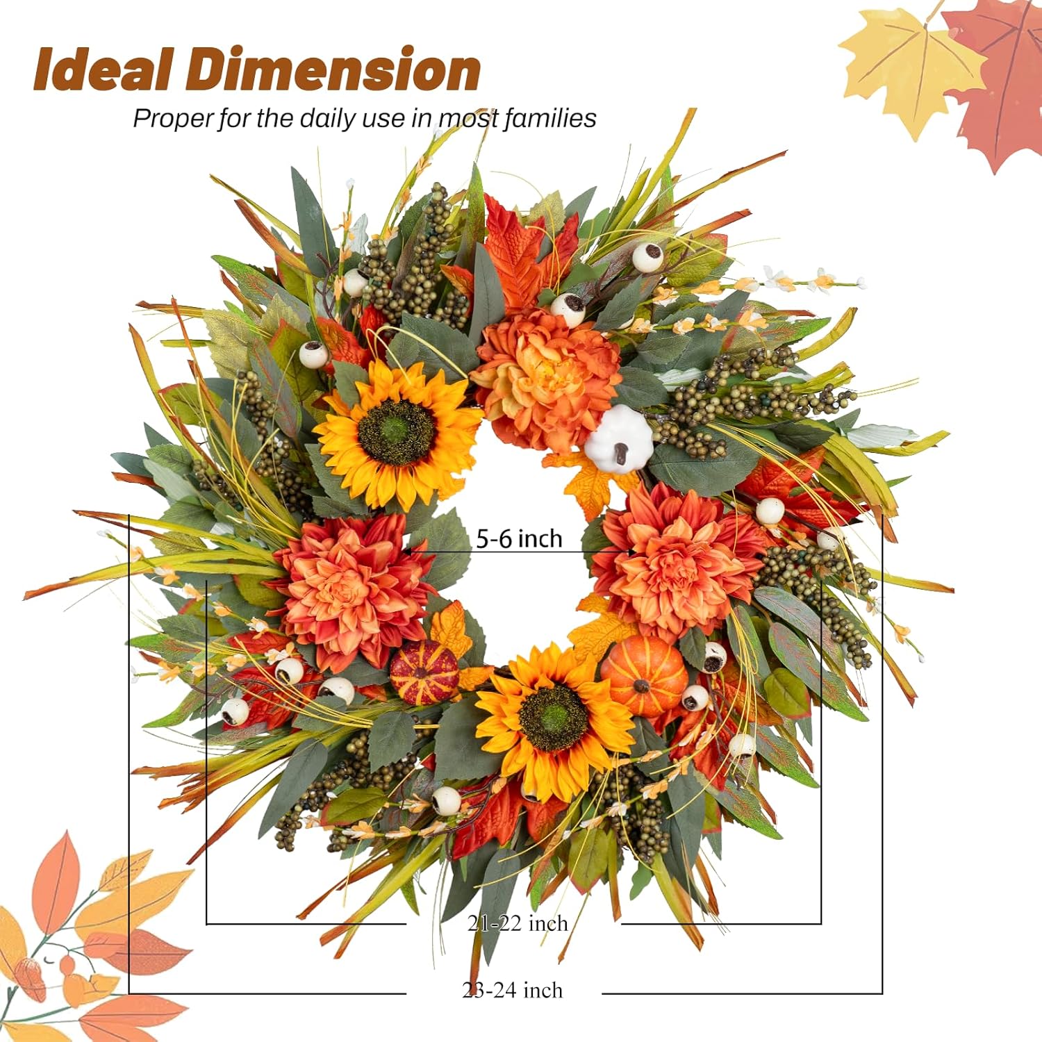 - Perfectly Sized for a Welcoming Impression – 24 Inches of Seasonal Beauty Designed at the ideal size, our fall wreaths for front door 24 inch give your guests an immediate sense of welcome. Whether your door is wood, glass, or painted, this full and textured wreath stands out in just the right way — elegant, bold, and balanced.