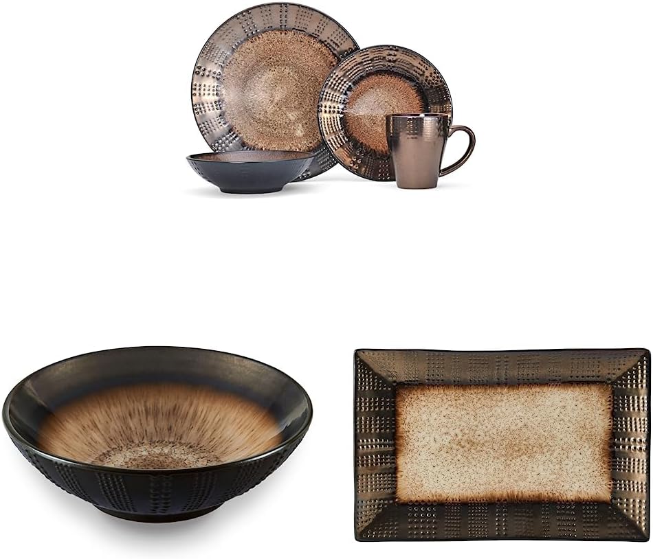 Gourmet Basics by Mikasa Verona 16-Piece Dinnerware Set & Cream Serving Bowl, 9 Inch & Cream Rectangular Platter, 13.75 Inch