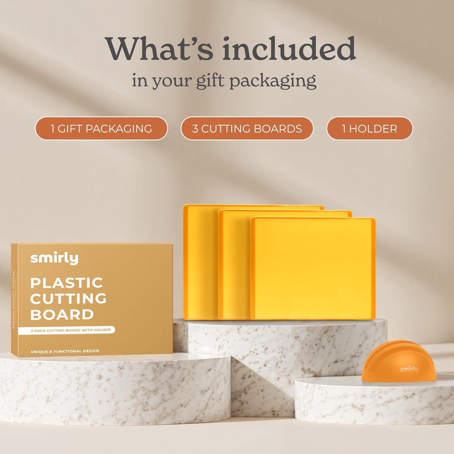SMIRLY Plastic Cutting Board Set with Holder 3 Pieces, Non-Slip Dishwasher Safe Chopping Boards for Kitchen, Yellow