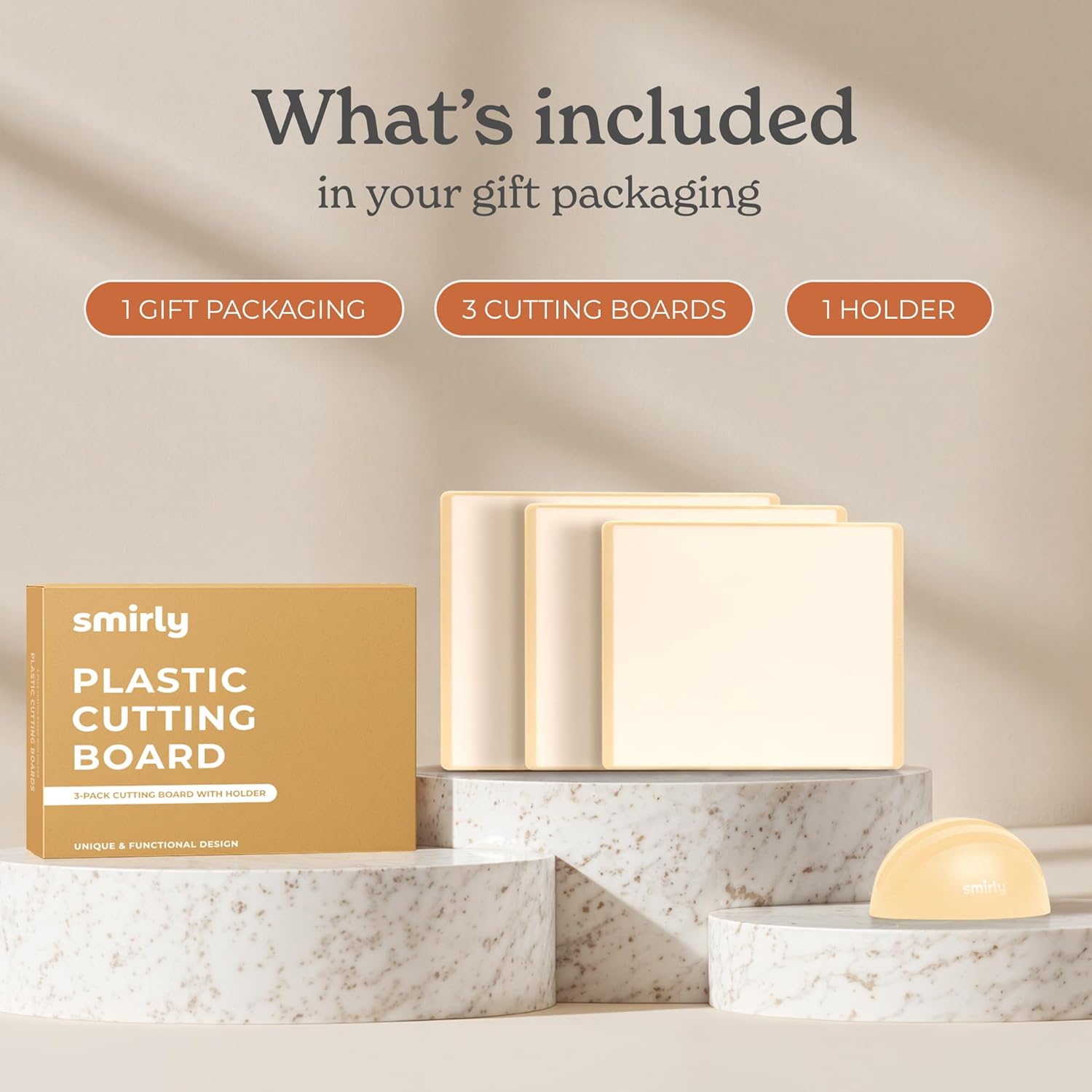 SMIRLY Plastic Cutting Board Set with Holder 3 Pieces, Non-Slip Dishwasher Safe Chopping Boards for Kitchen, Cream White