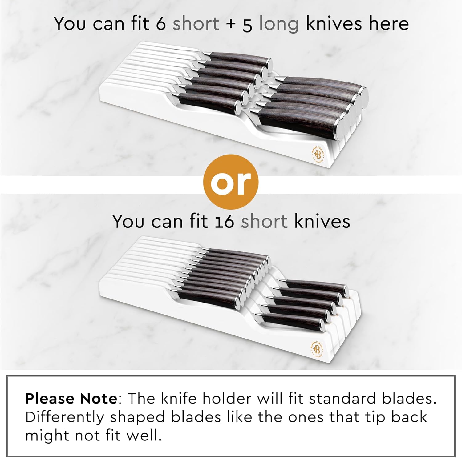 - IN DRAWER KNIFE ORGANIZER: No more keeping a clunky knife block out on your counter. (Measure your drawer and knife heights to see if it’ll fit for you.) The steak knife block fits a total of 5 large knives + 6 small ones, or 16 short knives.