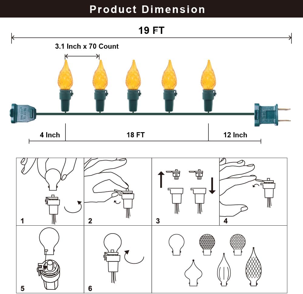 - End-to-End Connectable: C5 LED Fairy lights come with end to end connector, which is connectable up to 36 sets , expandable to a longer length for any project big or small requirement. UL 22# green wire is the standard for outdoor Christmas lights, reducing wire twisting, reducing tangles. Green wire blends with branches.