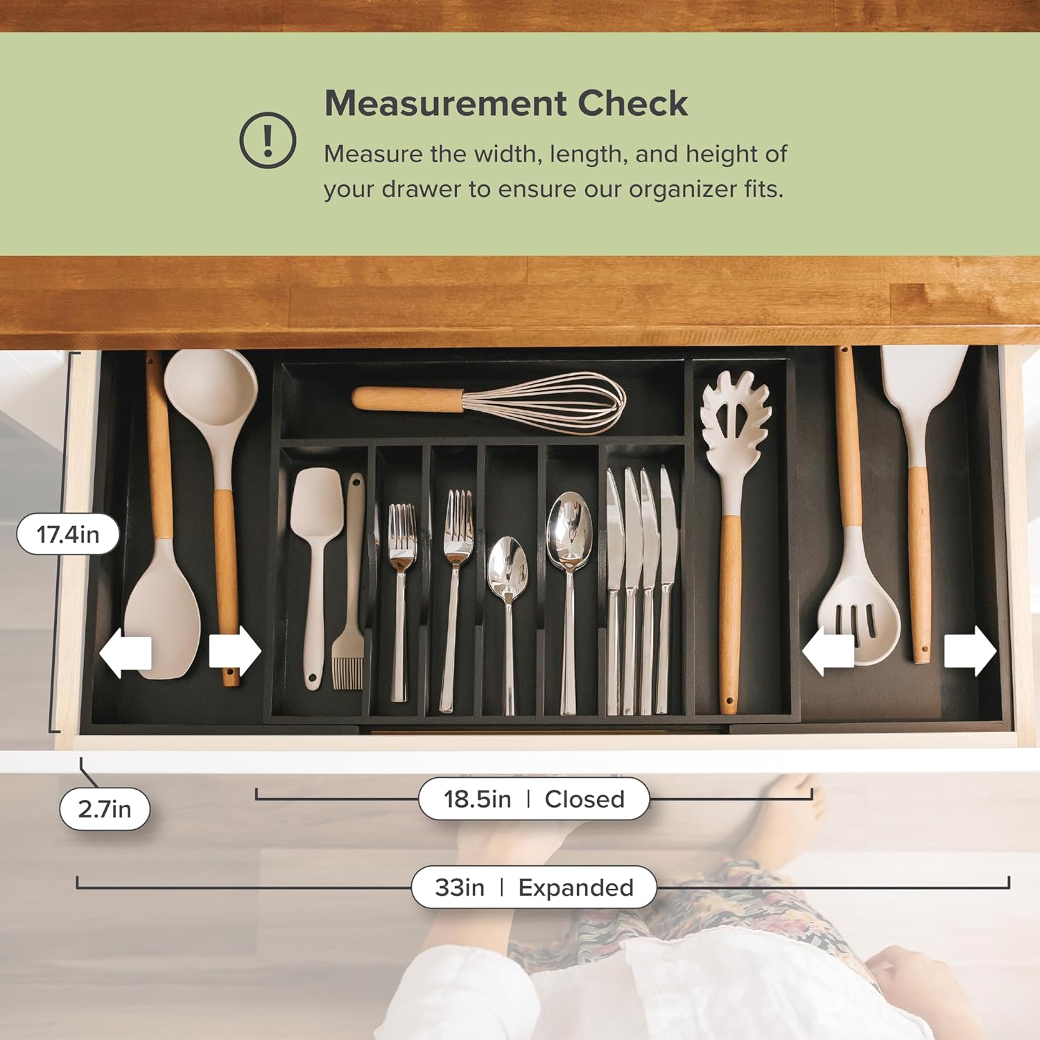 - MAXIMIZE YOUR DRAWERβS STORAGE CAPACITY: This 11-compartment (9 fixed + 2 adjustable) organizer measures 17.4β long x 2.7β tall and expands from 18.5β to 33β wide (and any width in between). Most other flatware organizers expand to 22β or 23β wide and are only 2β tall. Itβs amazing how much storage capacity an extra 0.7β in height adds when filling your organizer full of flatware and utensils!