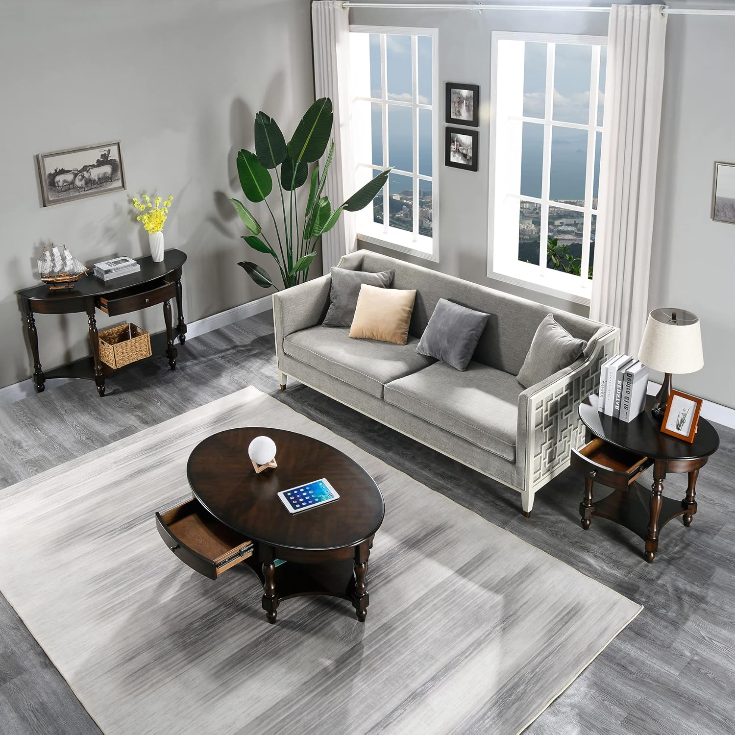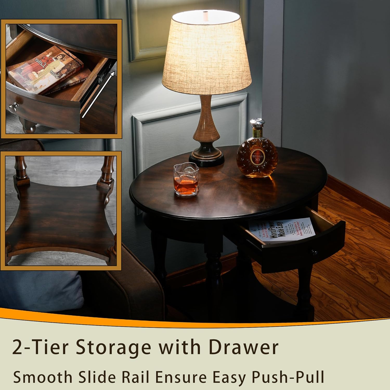- End Table with Enough Storage Space: the tabletop of this oval living room table is 28” x 22”,It provides enough space for living objects, drinks, snacks, remote controls, and magazines.The big drawer supply the private space for you. You just need enjoy your happiness time with your family.The below storage shelf is the additional space for you.
