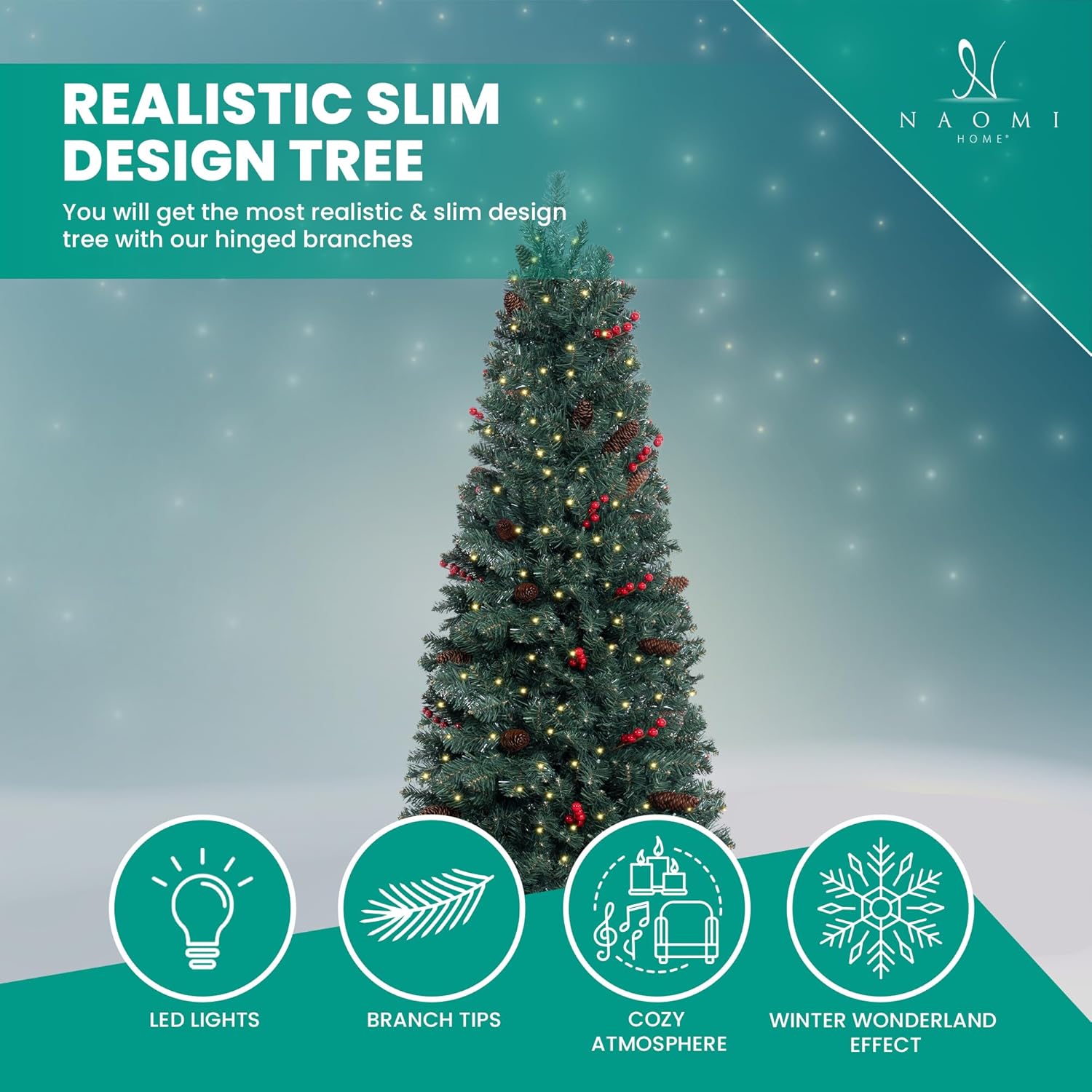 - COMES PRE-DECORATED TO SAVE TIME : The fake Christmas Tree comes Pre-lit with 250 incandescent lights, 30 Realistic Pine Cones and 29 Red Berries that make setting up your tree a breeze. The Prelit Christmas Tree 6.5ft emits a warm glow that highlights your decorations and holiday gifts making your Slim Christmas Tree extra-special. Naomi Home Christmas Trees with Lights always stand for trust and quality.