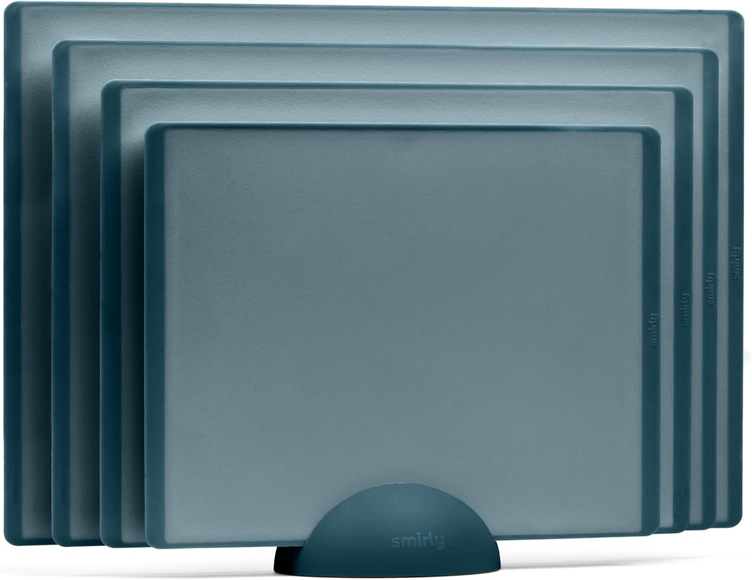 SMIRLY Plastic Cutting Board Set with Holder 4 Pieces, Non-Slip Dishwasher Safe Chopping Boards for Kitchen, Blue