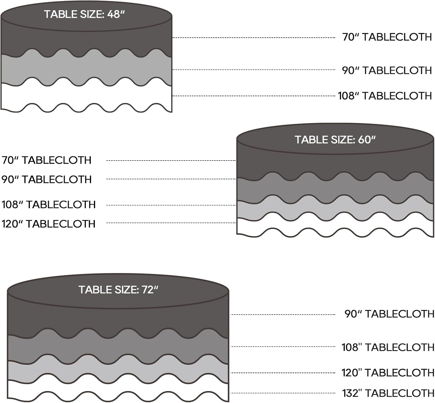 - Perfect size: This black tablecloth for round tables is available in a variety of sizes to choose from, perfect to meet a variety of needs. Note: please measure the length of the table and reserve the length of the hem before purchase
