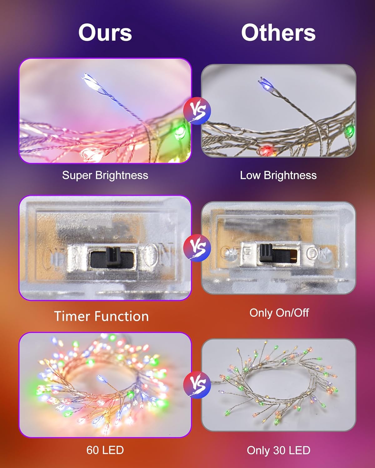 - Firefly Starry Lights: 2 pack 60 super bright multi-colored LED lights on 5 feet long ultra-thin wire with 1 Inches distance between LED bulbs and 12 Inches clear cable between wire and battery box, 6 hours timing lighting, steady on or steady on + timer mode optional