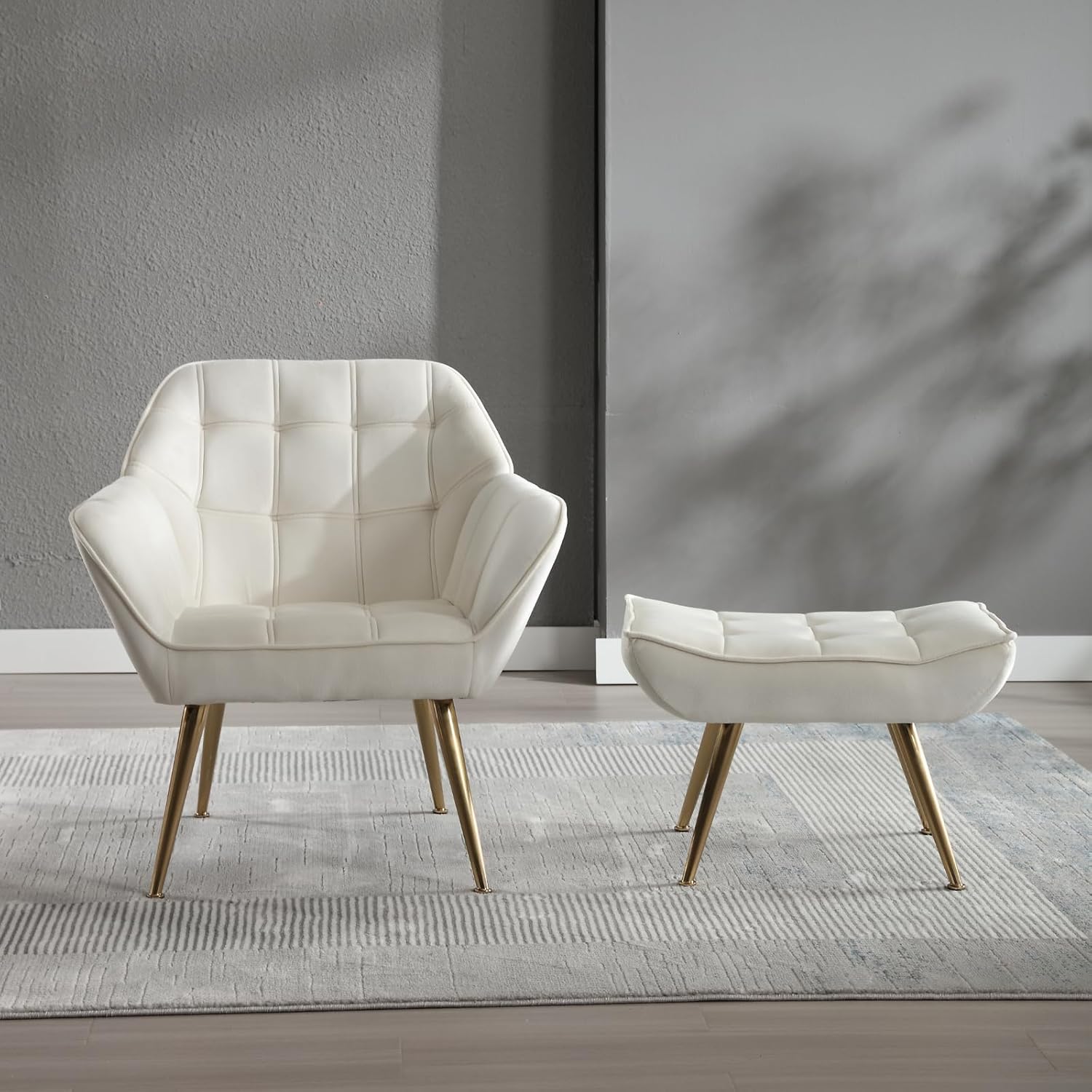 Modern Velvet Accent Chair with Ottoman Set of 2, Upholstered Lounge Chair with Footrest, Comfy Living Room Chair with Gold Legs Accent Side Chair Armchair for Small Space Bedroom, Beige