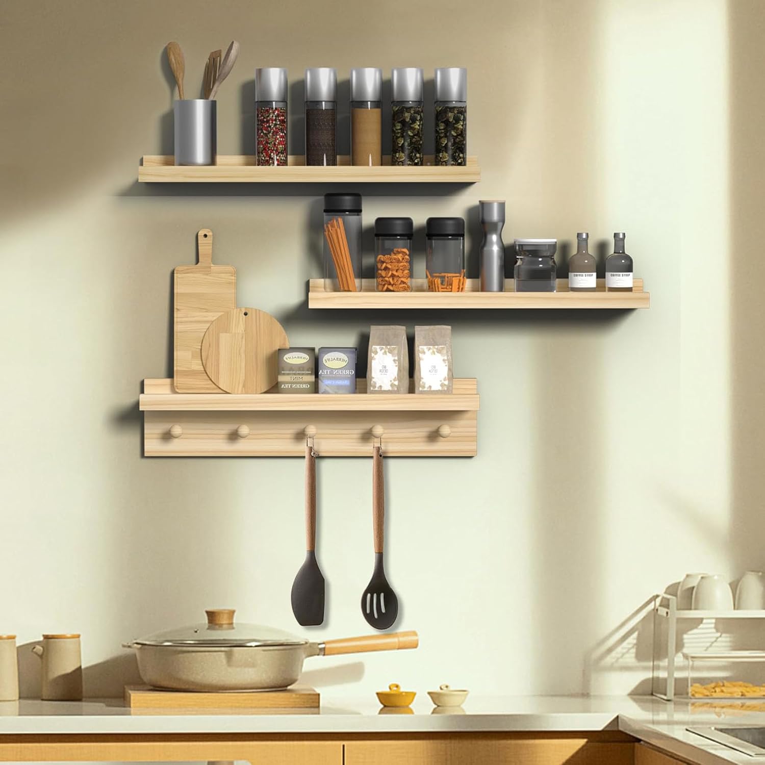 - 100% Pine Wood Craftsmanship: Meticulously fashioned from premium pine wood, the floating shelves and the wooden picture ledge with hooks guarantee exceptional durability. The selection of construction materials has undergone meticulous scrutiny, ensuring an appealing aesthetic while enduring weight and pressure, creating a dependable and steadfast user experience.