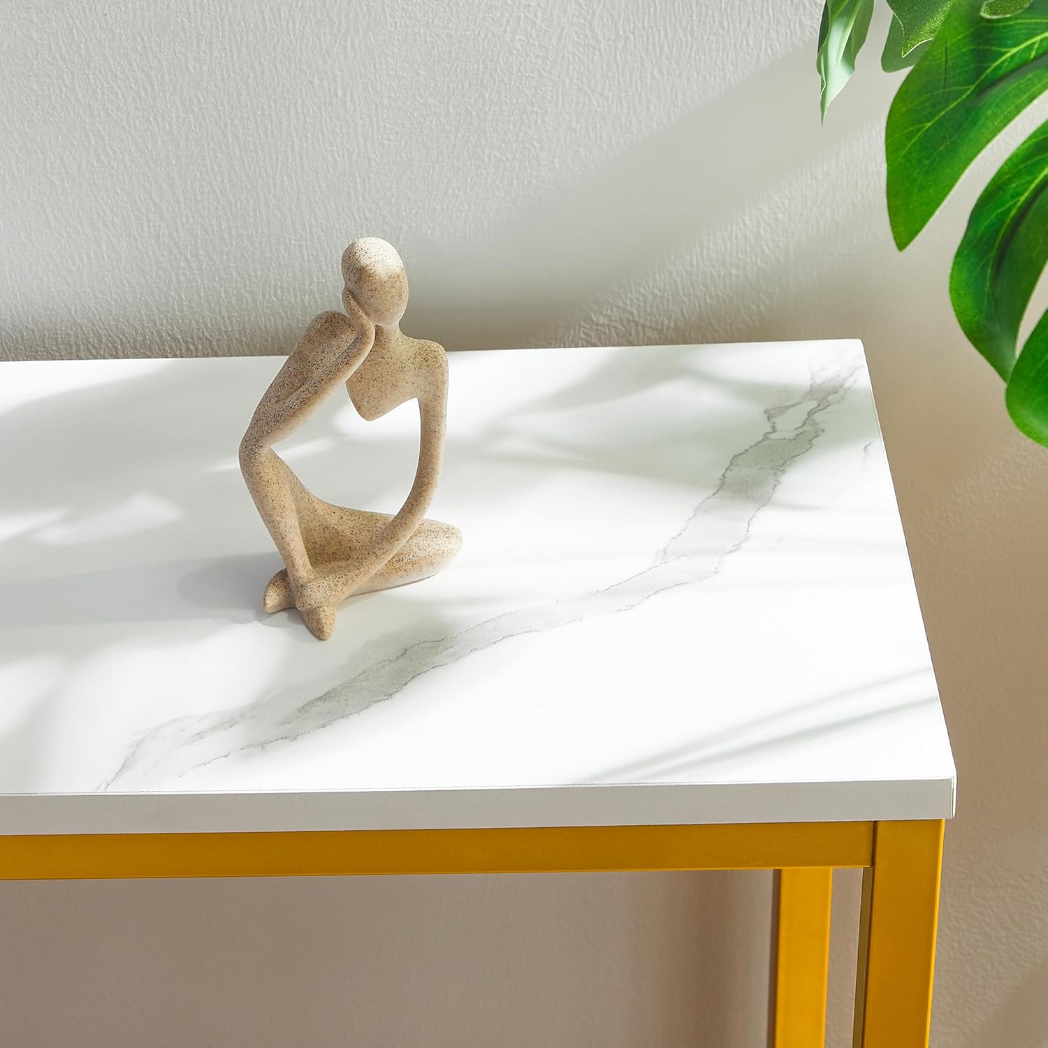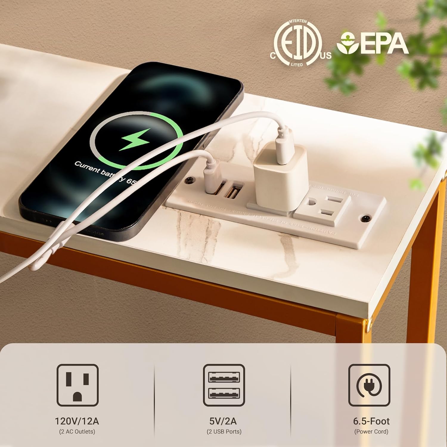 ELYKEN 2 Pack 5.9" Narrow Console Sofa Table with Power Outlets and USB Port, 5.9" Dx39.4 Wx31.1 H Marble Texture Skinny Couch Table with Golden Metal Frame