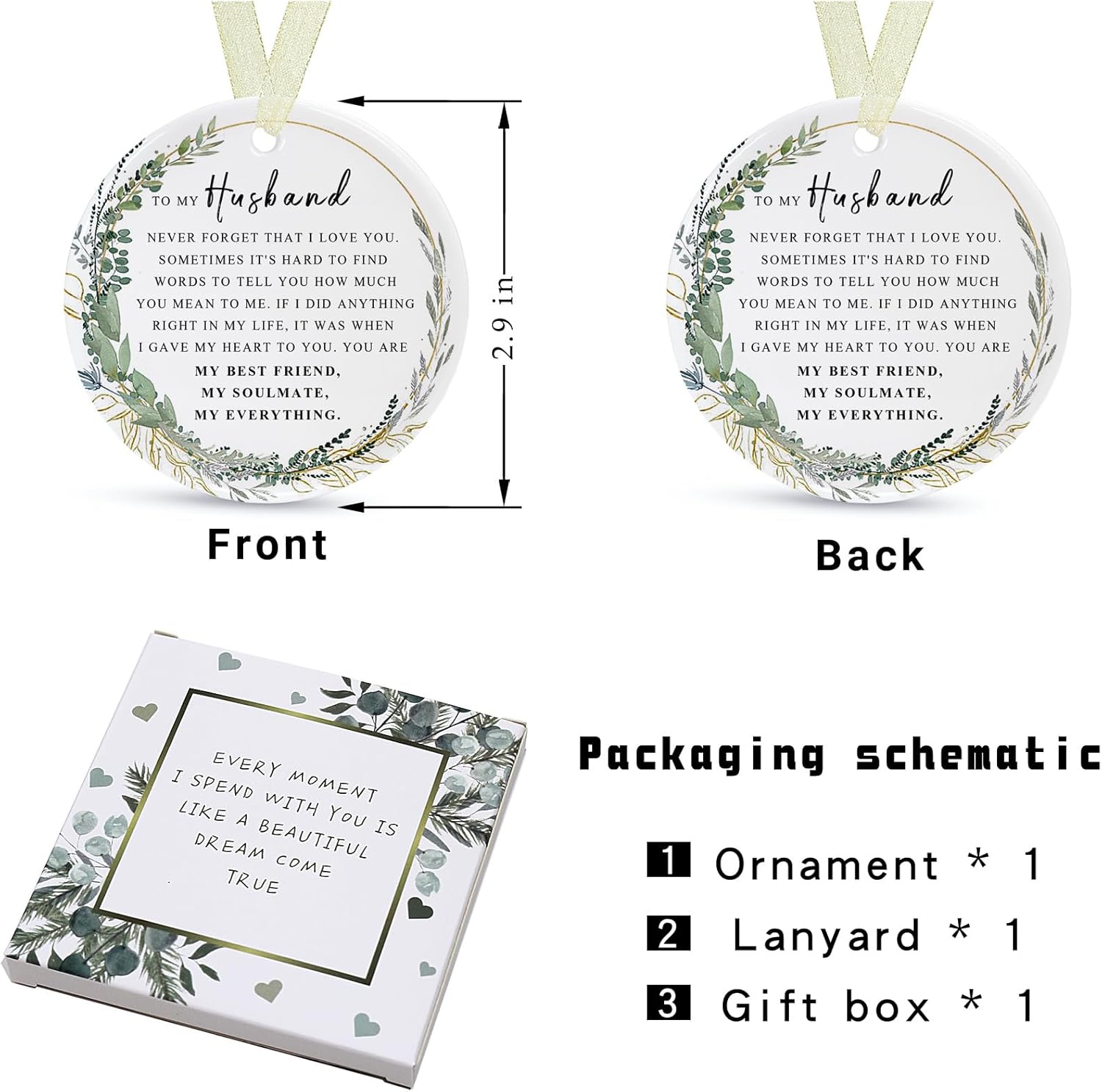 - 🌼【Perfect and delicate size】This is a husband memory ornament with a diameter of 2.9 inches and a thickness of only 0.18 inches. The product includes: a round husband ornamentt*1, a gift box*1 and a lanyard*1. The gift box comes with it makes it easy for you to give the best husband ever gifts directly to family and friends and other special people in your life, and the lanyard that comes with it helps to hang it easily on the Christmas tree or anywhere you want.