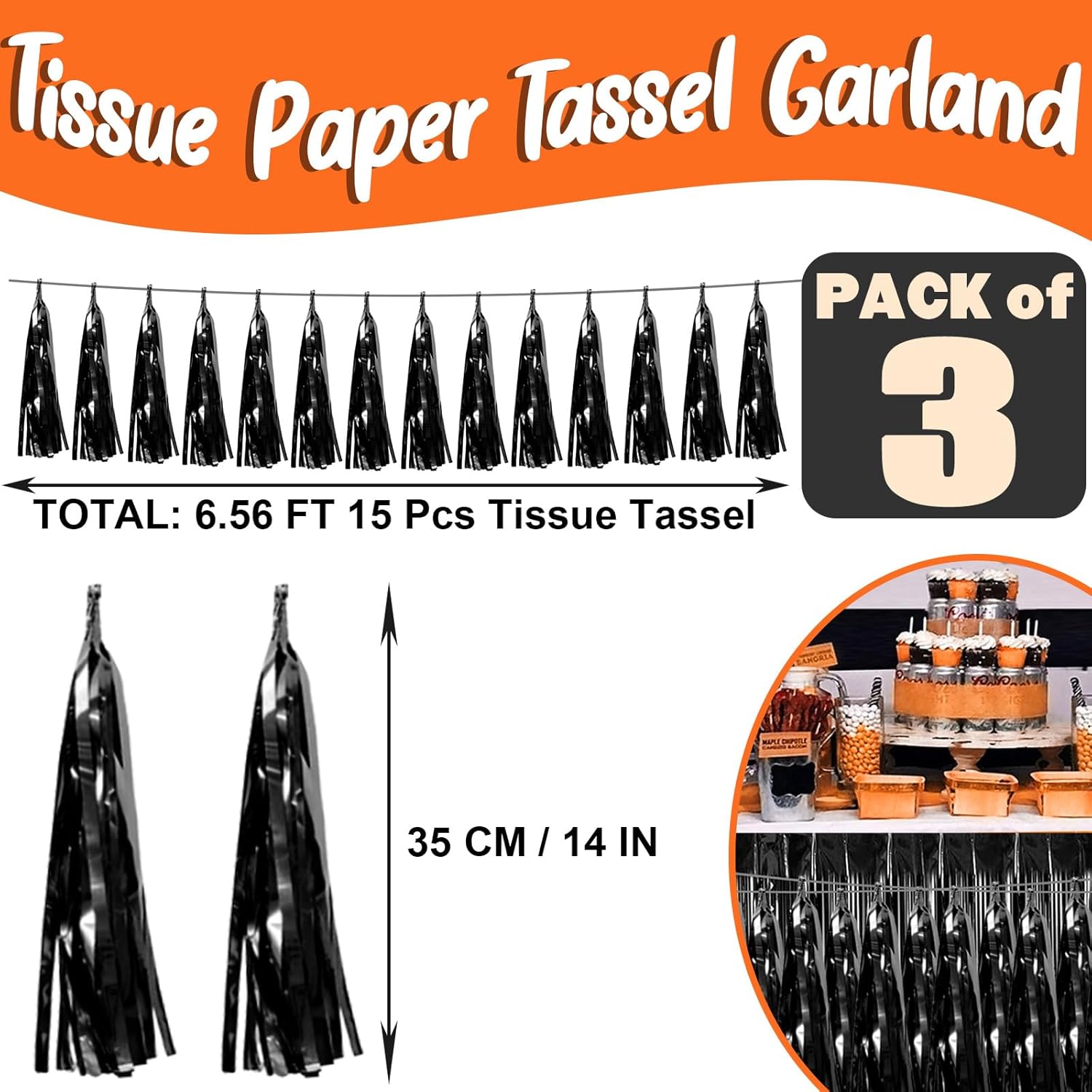- 【Black Party Supplies Set】: The total length of the black birthday tassels banner is 29.5 feet 45tassels, divided into 3 strips, each 9.8 feet long. Each banner contains 15 tassels, and each tassel measures 14 inches, for birthday decorations many occasions, and so on