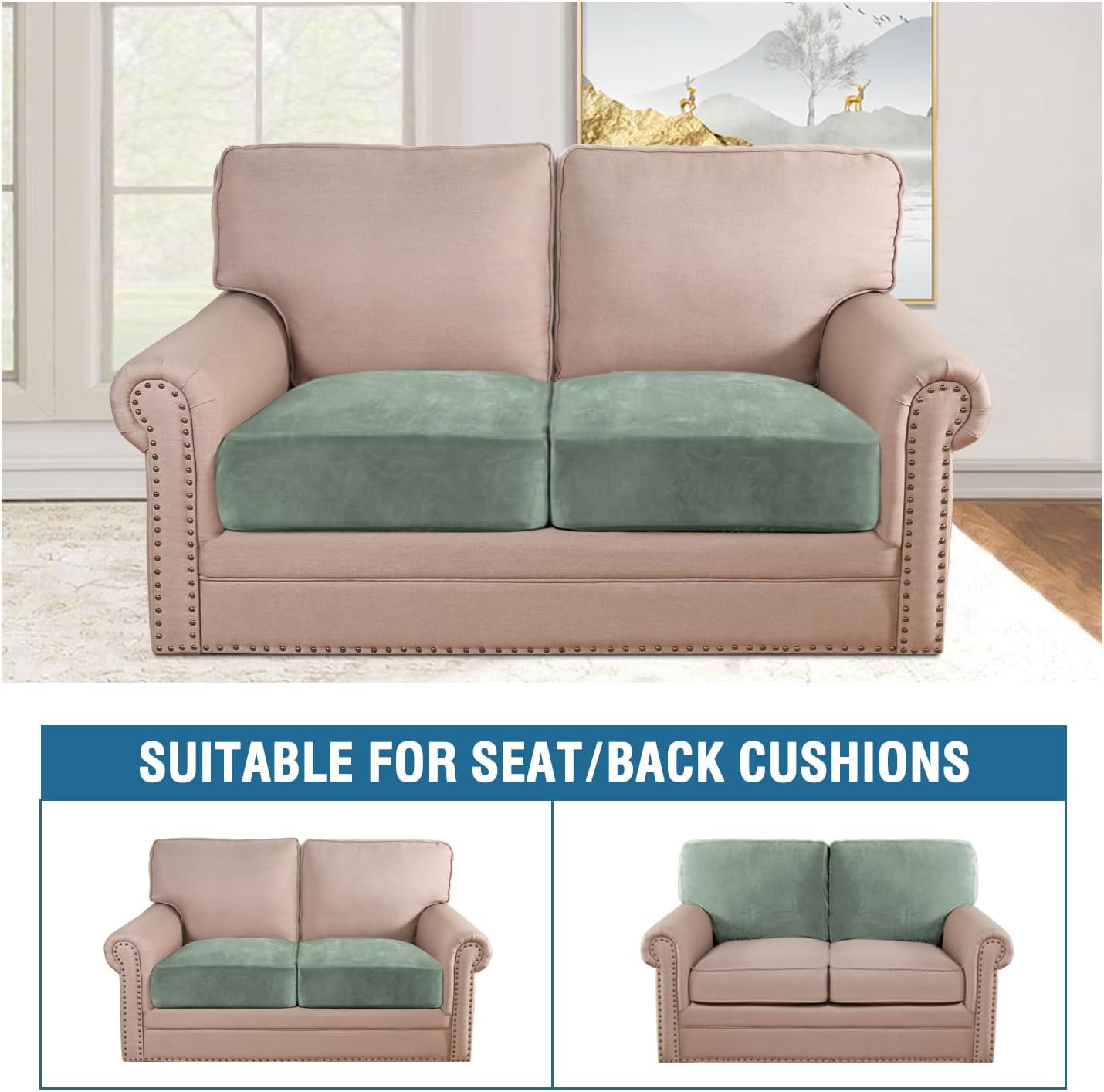 H.VERSAILTEX Velvet Stretch Couch Cushion Cover Plush Cushion Slipcover for Loveseat Cushion Furniture Protector Seat Cushion Sofa Cover (2 Piece Medium Sofa Cushion Covers, Sea Grass)