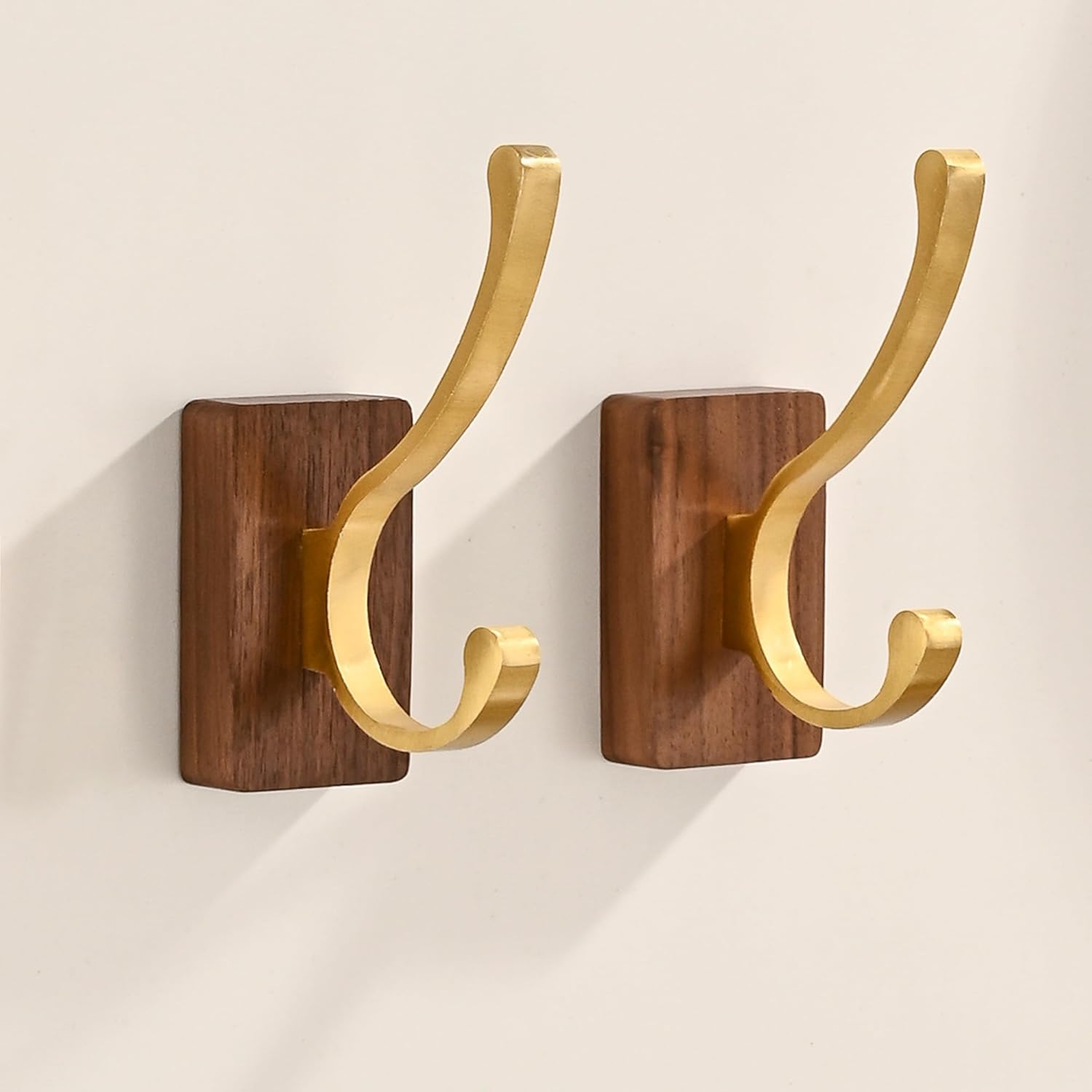 2 Pack Wooden Wall Hooks for Hanging, Adhesive Mounted Wall Mounted Boho Decorative Nature Wood Coat Hook for Towel Clothes Blanket Hat Backpack Robe Nursery Door Board Entryway Key Holder Gold