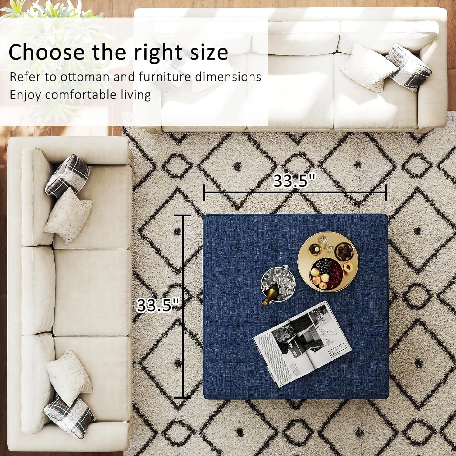 Large Square Ottoman Coffee Table, Linen Solid Upholstered Footrest Ottoman with Solid Wood Shelf Storage Tufted Coffee Table for Bedroom Living Room, Navy Blue