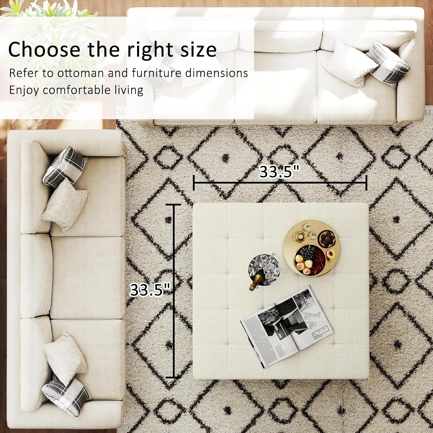 Large Square Ottoman Coffee Table, Linen Solid Upholstered Footrest Ottoman with Solid Wood Shelf Storage Tufted Coffee Table for Bedroom Living Room, Ivory