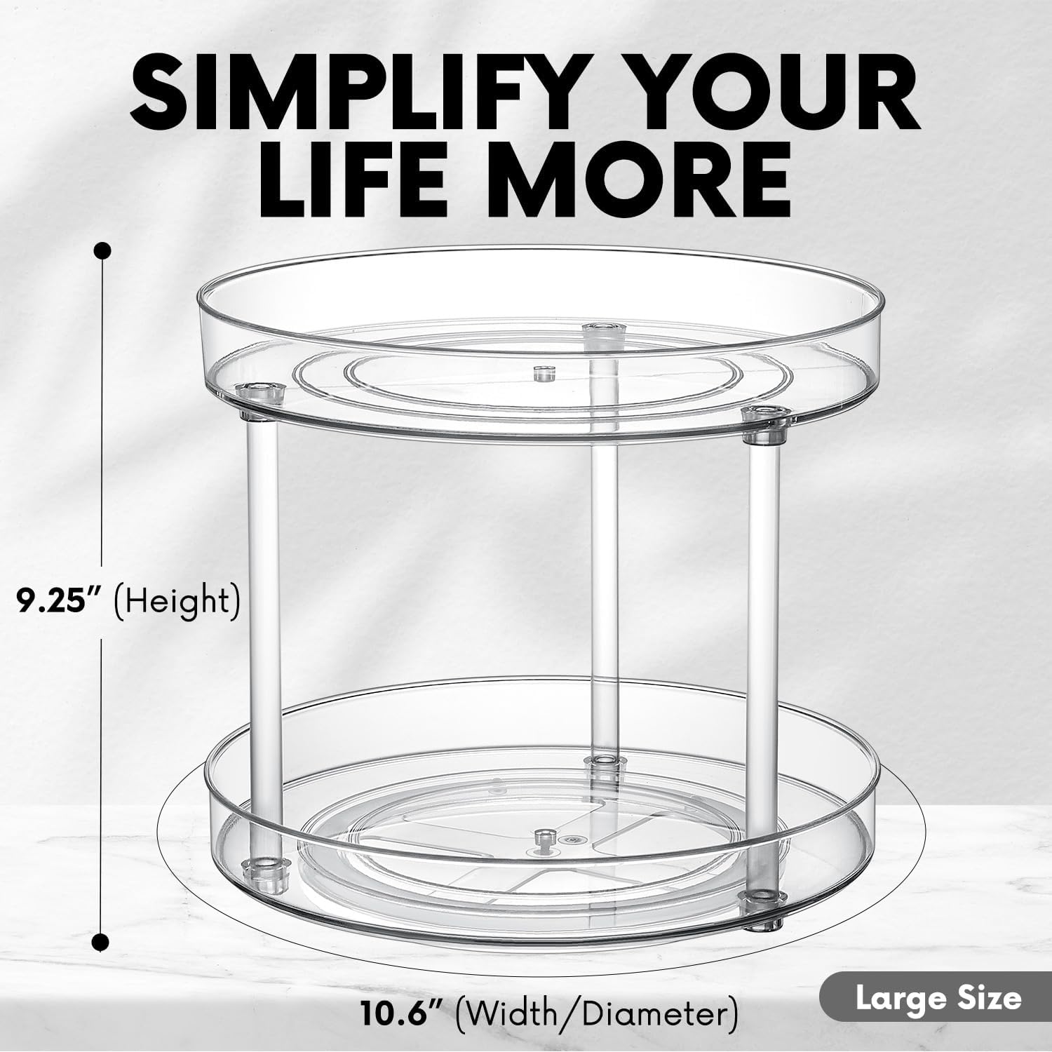 - COMPACT YET SPACIOUS - Our 2 tier lazy susan spice organizer boasts an impressive storage capacity for condiments, spices, makeup, skincare, perfume, cosmetics, and other small essentials, all while maintaining a compact footprint that won't overwhelm your space. At 10.6"D x 9.25"H, this turntable can fit seamlessly into your pantry, cabinet, dresser, and even in most refrigerators.