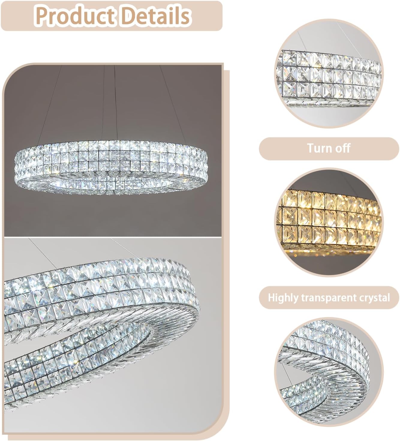 - 【Smart Crystal Chandelier】:The advantage is that individual LED bulb can be replaced .It is equipped with a remote control and APP control for seamless dimming between warm white (2700K) and cold white (6000K),as well as adjustable brightness ranging from 5 to 100 percent.