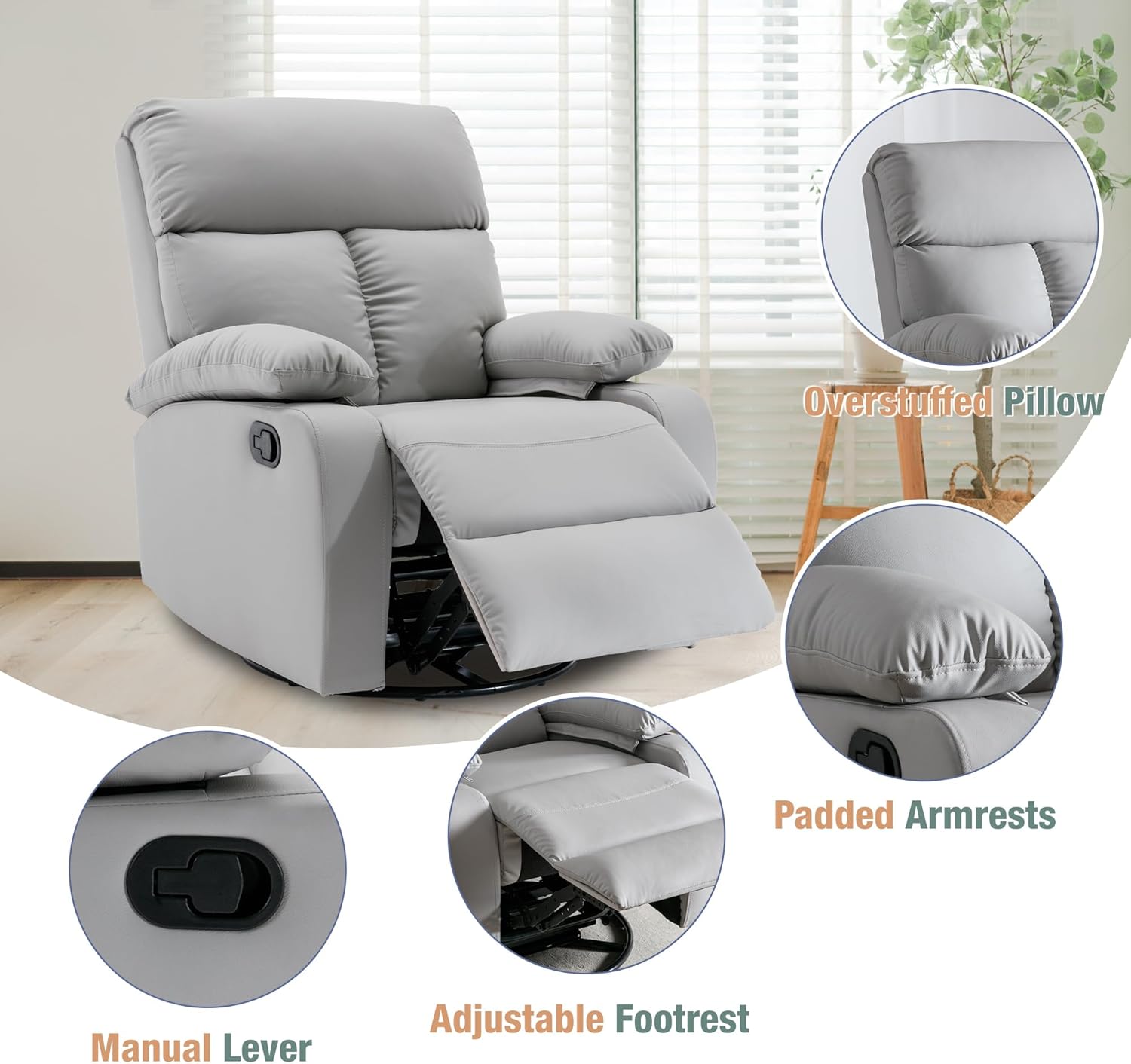 - Anti-scratch Leather Recliner Rocking Chair: This light grey rocker recliner chair is made of anti-scratch leather with the touch of leather, providing a unique visual effect. Small rocker recliners for small spaces has a simple and fashionable design, making the recliner rocking chair suitable for all occasions. And the small rocker recliners for small spaces unique waterproof, anti-scratch performance, easy to care and very well match with other leather swivel rocker recliner in your home