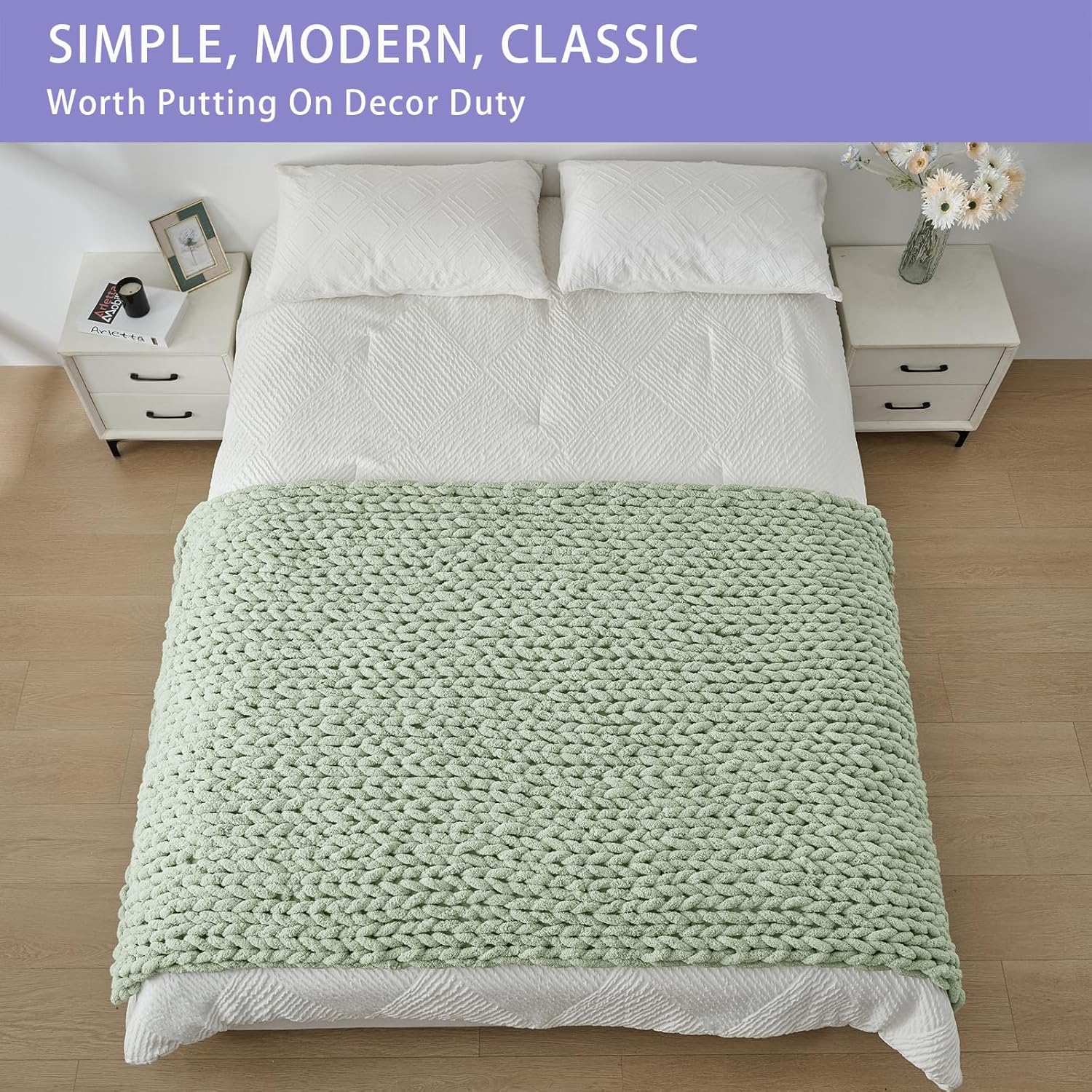Bigacogo Chunky Knit Throw Blanket for Couch, 40x80 inches, 100% Hand Knitted with Thick Jumbo Chenille Yarn, Cozy Soft Large Rope Knot Cable Crochet Blankets for Sofa Bed Living Room, Sage Green