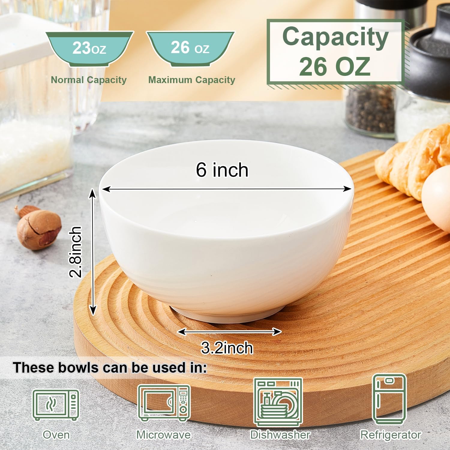 White Soup Bowls 6 in, 26Oz round Large Ceramic Bowl set of 6, Deep Porcelain Bowls for Cereal, Salad, Noodles, Dishwasher/Microwave safe