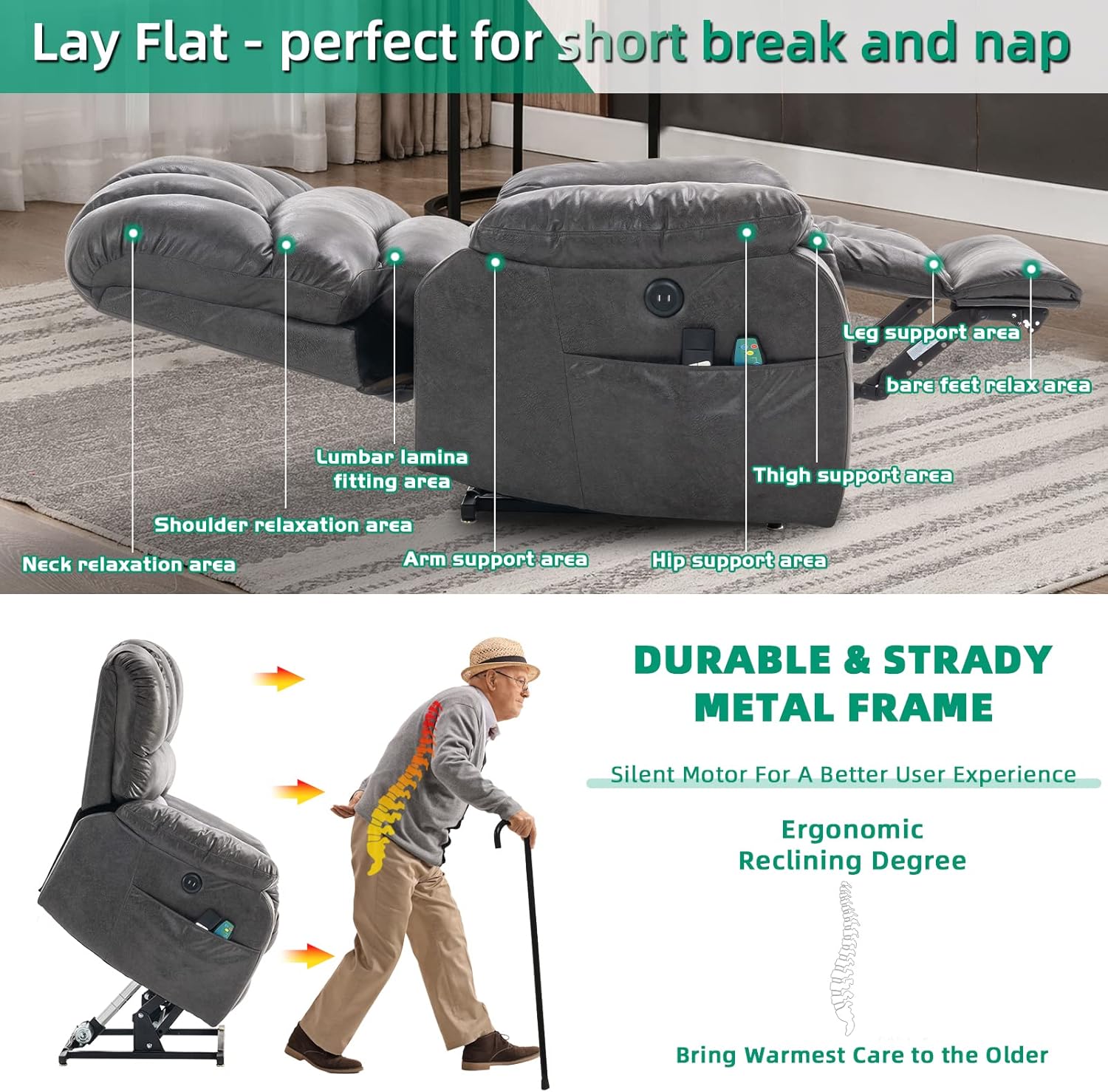 - ăDeeper Seat & Delicate Fabrică- This upgraded power lift chair is equipped with oversized and wider armrest, back and seat, which make it an ideal choice for people in bigger size. Overstuffed upholstery padded with high density sponge brings comfort, once you take a seat, you'll never want to get up. The bronzing suede fabric with a special process to bring a leather-like visual finish on the suede surface, soft to the touch, eco-friendly and breathable, wear-resistant and stain-resistant.