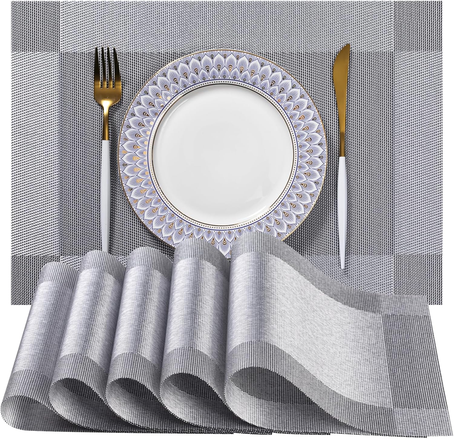 LEXMORE Placemats Set of 6 Vinyl/Plastic Woven Place Mats for Kitchen Table Indoor/Outdoor Washable Placemat Wipeable Dining Table Mats(Silver Cube)
