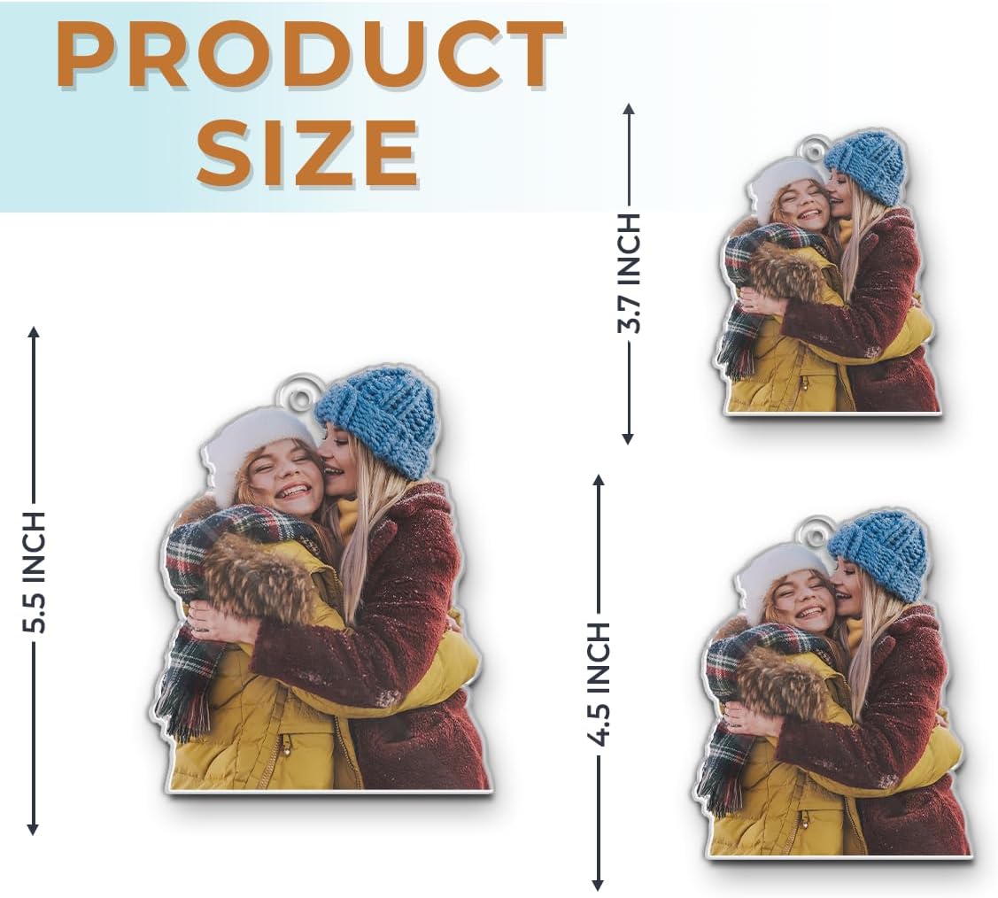 - π Custom Ornaments With Pictures: Crafted with high-quality acrylic, this ornament features a height of 3.7 inches (~9.5 cm) and a slim 0.12" thickness, ensuring its durability and lightweight design. The ornament can be customized with your photo, which makes it a truly personal and cherished gift. We include a hanging gold cord loop to easily hang on your Christmas tree or an ornament stand.